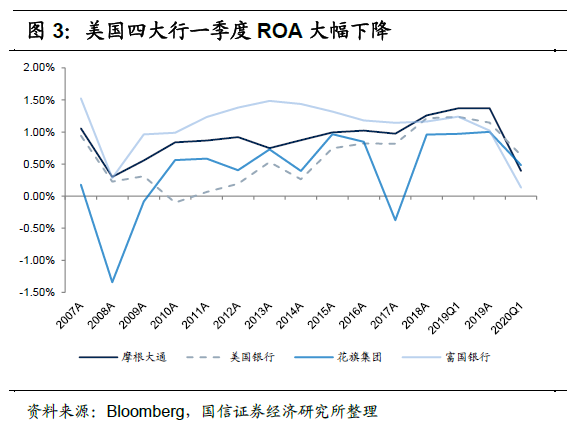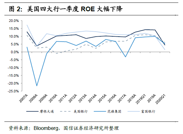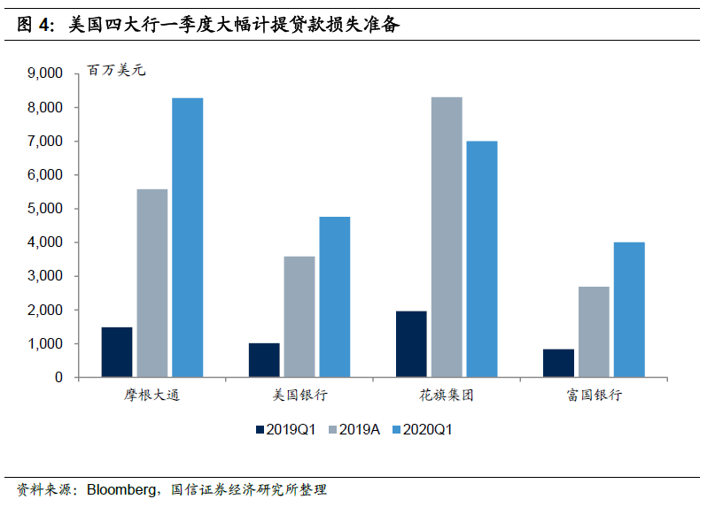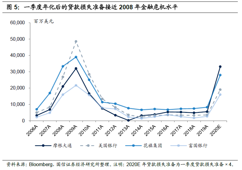 受公共卫生事件和原油价格大跌的冲击,经济前景预期恶化,加上2020年美国8家全球系统性重要银行以及在美国证券交易委员会报备的大型银行正式采用当前预期信用损失(CELC)会计准则,美国四大行一季度大幅计提拨备。摩根大通/美国银行/花旗集团/富国银行2020年一季度分别计提贷款损失准备83/48/70/40亿美元,同比分别增长454%/370%/256%/374%。四大行2020年一季度计提的贷款损失准备超过了2013年以来每年全年计提的水平,如果简单的年化(2020年一季度拨备计提×4),2020年全年拨备计提水平接近2008年金融危机期间水平,反映了四大行对美国经济前景预期较为悲观。