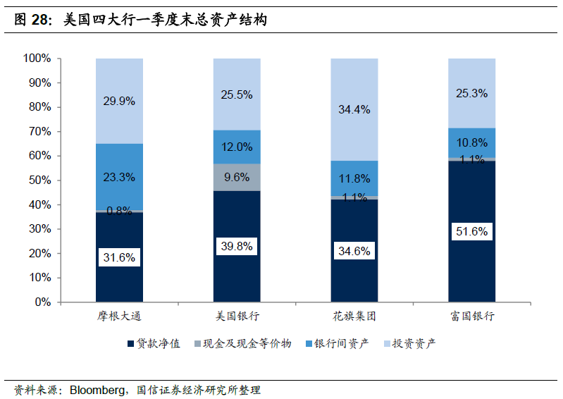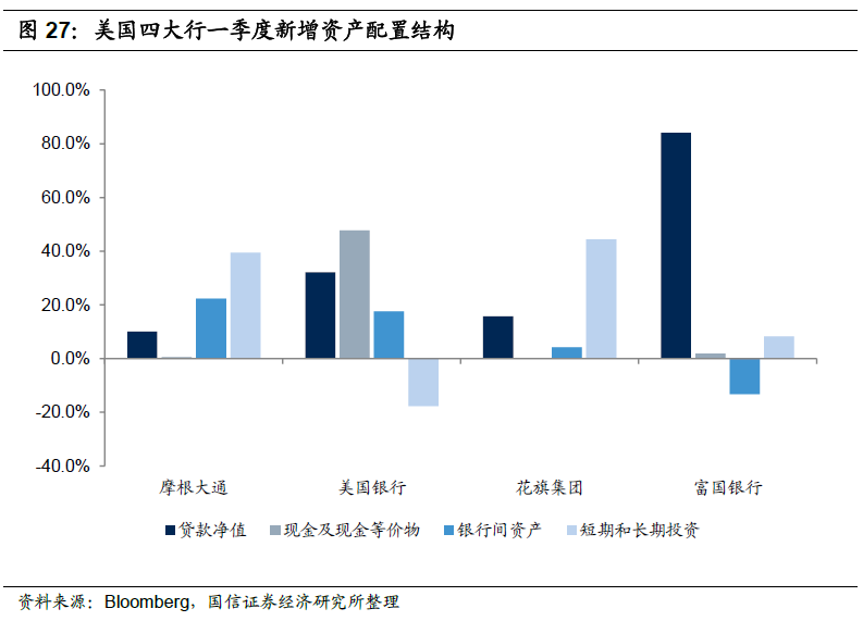 从新增资产配置结构来看,美国四大行新增资产配置方向差别较大,其中摩根大通和花旗集团新增资产主要是配置投资类资产,投向信贷的比重并不高,富国银行新增资产则基本都投向了信贷,花旗集团新增资产则主要以现金及现金等价物形式存在,投向信贷资产的比例也比较高,但是压缩了投资类资产,期末花旗集团投资类资产占比仍高于同业。。