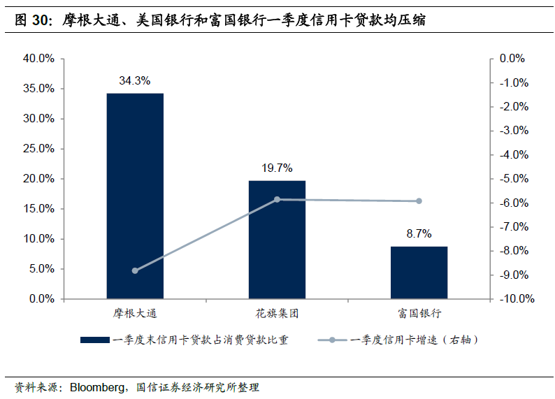 信贷投向方面,摩根大通、美国银行、花旗集团和富国银行一季度贷款分别扩张了5.8%、6.7%、6.8%和4.8%,主要来自商业贷款的增长。消费贷款方面,除了美国银行维持稳定外,其他三大行消费贷款都出现了不同程度的压缩。