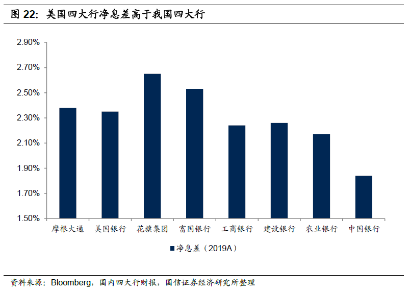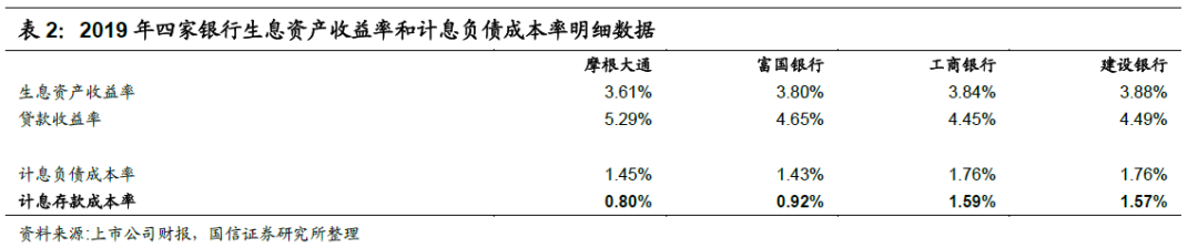 美国四大行净息差高于我国大行,核心优势是极低的存款成本。我们对比了摩根大通、富国银行、工商银行和建设银行平均收益率(成本率)明细,摩根大通和富国银行贷款收益率虽然高于工商银行和建设银行,但生息资产收益率整体并无优势。负债端来看,摩根大通和富国银行的计息存款成本率大幅低于国内大行,2019年摩根大通和富国银行计息存款成本率仅有0.80%和0.92%;另外,美国部分支票账户不支付利息,带来更低的存款综合成本率。