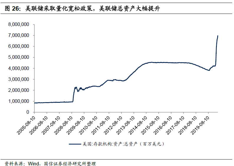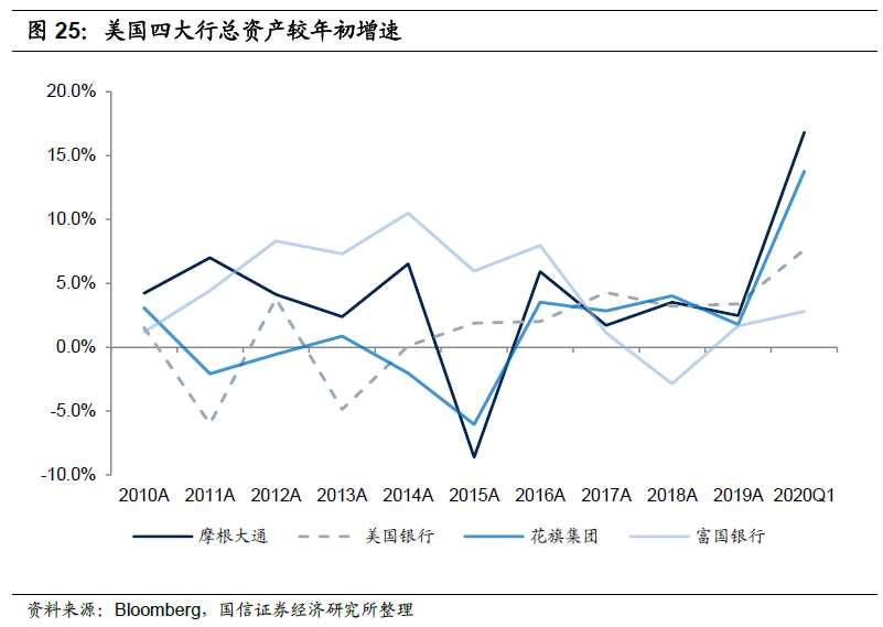 公共卫生事件和原油价格大幅下跌的冲击,美联储采取了“零利率+量化宽松”政策,截止2020年5月13日,美联储总资产规模达6.98万亿美元,较年初增长了2.77万亿美元。在此背景下,美国银行业一季度资产大幅扩张,摩根大通、美国银行、花旗集团和富国银行一季度总资产分别扩张了16.8%、7.6%、12.8%和2.8%。摩根大通、美国银行、花旗集团一季度资产扩张幅度超过了2010年以来每年全年的扩张速度。富国银行资产扩张幅度较低,主要是假账户事件后受监管整顿,前文已述。