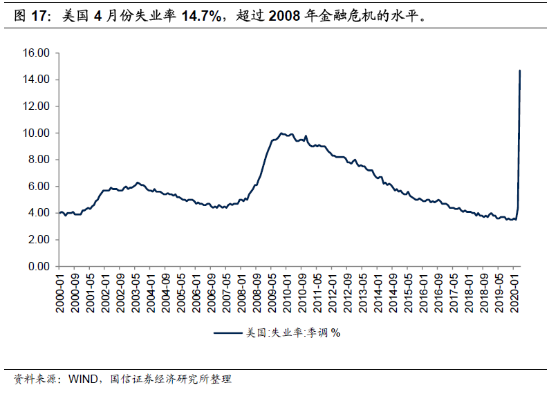 一季度美国四大行坏账净核销率和不良贷款率仅小幅提升,整体表现较为平稳,明显好于2008年金融危机前的水平。但美国公共卫生事件3月份开始蔓延,公共卫生事件对经济的冲击在一季度还未充分体现,另外,一季度油价的大跌对经济的冲击也需逐步显现,银行坏账也有一定的滞后期,因此美国四大行一季度资产质量的表现并未充分体现油价和公共卫生事件的冲击。从失业率来看,美国3月份失业率4.4%,较2月份提升0.9个百分点,4月份失业率则大幅提升至14.7%,因此对银行未来资产质量表现仍需密切关注。
