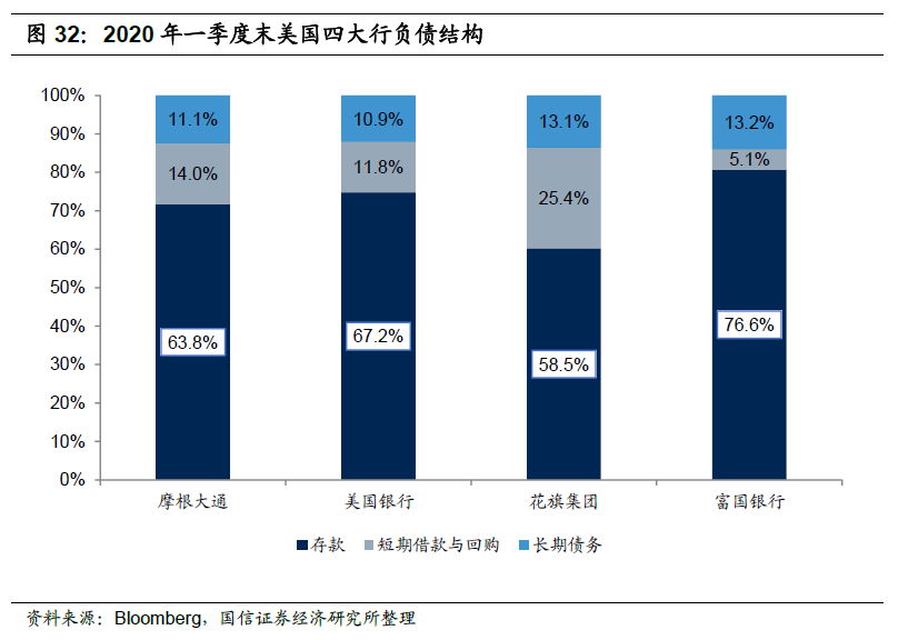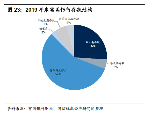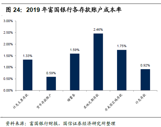 美国存款利率市场化程度高,存款账户种类较多,包括支票存款账户、储蓄存款账户、定期存款账户、货币市场存款账户等,其中不计息的存款和低息的货币市场存款占比较高,这是美国银行业存款成本偏低的主要原因。以富国银行为例,2019年末不计息存款占存款总额比重为26%,货币市场存款比重为56.8%,货币存款账户利率仅0.59%。2019年富国银行计息存款成本为0.92%,考虑不计息存款后的存款综合成本仅为0.68%。
