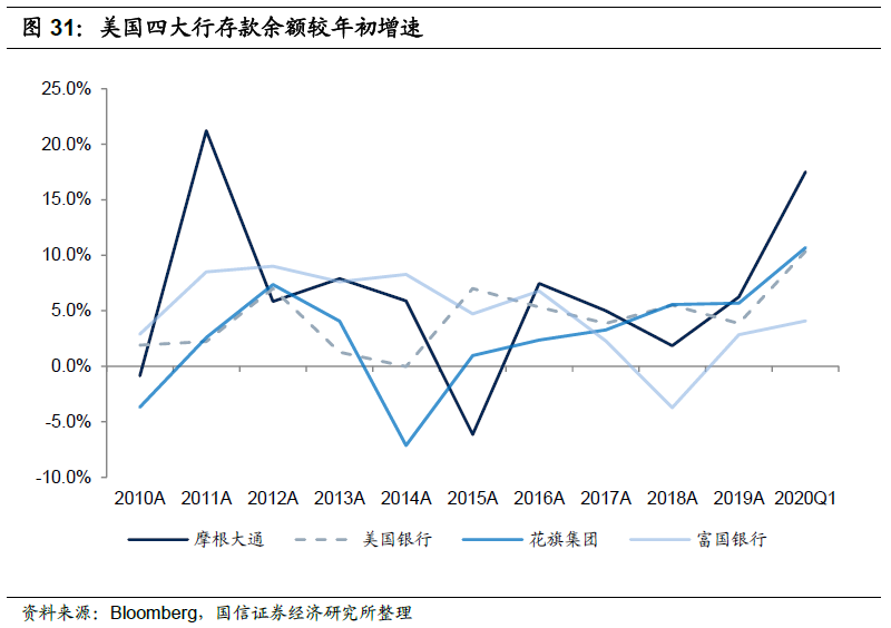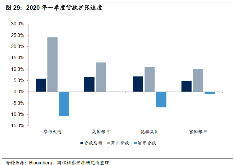 摩根大通、美国集团、花旗银行和富国银行一季度存款分别扩张了17.5%、10.4%。10.7%和4.1%,实现了金融危机以来存款的最快扩张,这也反映了居民和企业对美国经济前景预期较悲观,企业投资意愿不强,居民开始增加储蓄。
