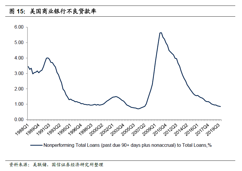 与国内四大行相比,由于美国银行业不良贷款主要指逾期90天或以上的贷款,因此将其与我国四大行逾期90+贷款比率相比较,2019年末美国四大行不良贷款率低于我国,表明美国四大行当前信贷资产质量表现较好。
