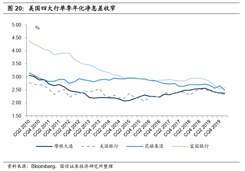 2019年7月以来美联储正式进入降息周期,2019年三次降息,共下调利率75bps;2020年受公共卫生事件和原油价格大幅下跌冲击,美联储连续两次降息,共下调利率150bps至零利率。在降息周期中,美国四大行净息差持续收窄,2020年一季度摩根大通、美国银行、花旗集团和富国银行净息差分别为2.37%、2.33%、2.48%和2.58%,同比分别收窄19bps、18bps、24bps和33bps。