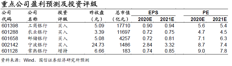 受公共卫生事件公共卫生事件和油价大幅下跌冲击,全球银行股股价都出现了较大幅度的下跌,与美国相比,我国公共卫生事件已被控制,国内经济活动基本上已经恢复到正常水平。更重要的是,我国经济财政政策和货币政策空间都比较大,经济韧性较强,我国也不会快速进入长期低利率环境,因此我国银行业的经营环境理论上是优于美国银行业的。当前我国银行的估值水平也没有高于美国银行业,我们认为国内银行股具备投资价值。我们维持行业“超配”评级不变,并重点推荐估值极低、盈利稳定的大型国有行,包括工商银行、农业银行、邮储银行等。同时也推荐其他基本面优异的中小银行,包括宁波银行、常熟银行等。