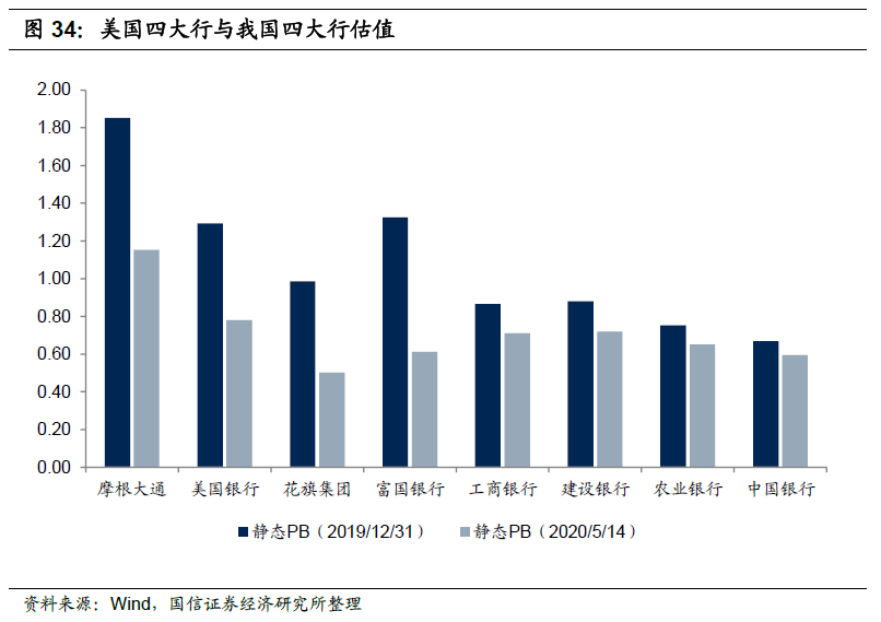 2月下旬-3月下旬美国四大行股价出现暴跌,3月下旬之后股价企稳,但未见明显反弹趋势。年初至今(2019/5/14),摩根大通、美国银行、花旗集团和富国银行股价累计跌幅分别为37%、38%、47%和55%,KBW BANK指数在此期间下跌了42%。截止2019年5月14日,摩根大通、美国银行、花旗集团和富国银行静态PB分别为1.15x、0.78x、0.50x和0.61x,工商银行、建设银行、农业银行和中国银行静态PB分别为0.71x、0.72x、0.65x、0.59x,摩根大通和美国银行估值仍高于我国大行。