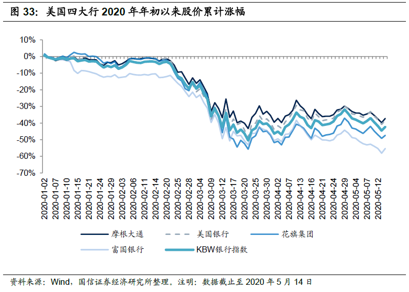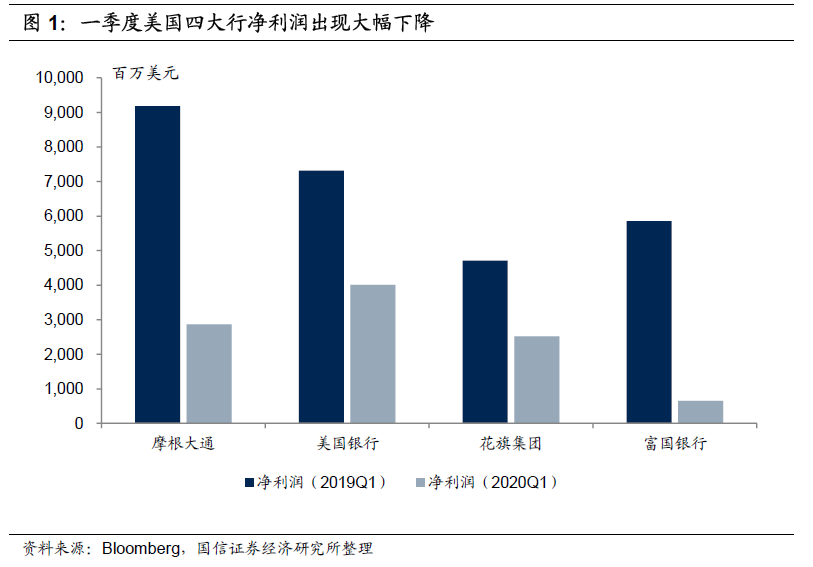 公共卫生事件和原油价格大跌给全球经济带来较大冲击,各国纷纷采取积极的政策托底经济,美国实施“零利率+量化宽松”政策,低利率环境和经济前景悲观预期给美国的银行经营带来了较大的压力。本报告主要聚焦美国四大行(摩根大通、美国银行、花旗集团、富国银行)在公共卫生事件冲击之下的经营情况和股价表现。