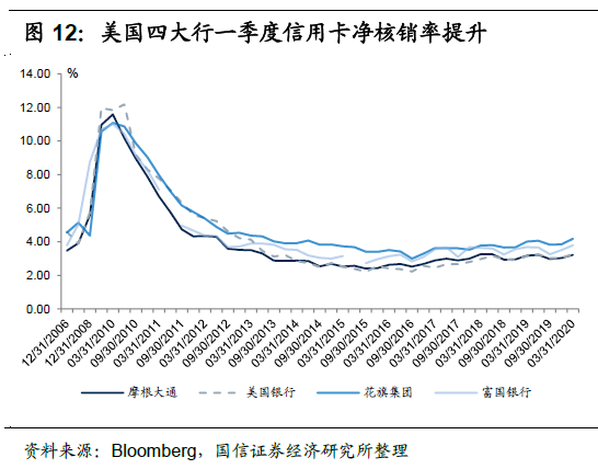 从坏账净核销率来看,美国银行、花旗集团和富国银行2020年一季度年化坏账净核销率(Net charge-offs rate)分别是0.45%、1.21%和0.38%,环比去年4季度分别提升了6bps、9bps和6bps,摩根大通期末坏账净核销率为0.61%,环比下降2bps,均处于较低水平且表现平稳。从风险较高的信用卡贷款来看,摩根大通、美国银行、花旗集团和富国银行信用卡贷款年化坏账净核销率分别为3.23%、3.26%、4.18%和3.79%,较年初分别提升了19bps、21bps、34bps和28bps,信用卡风险暴露有所增加但整体可控。与行业趋势一致,美国四大行贷款总额的坏账净核销率和信用卡贷款坏账净核销率均相对处在一个较低的水平,明显优于2008年金融危机时的水平。