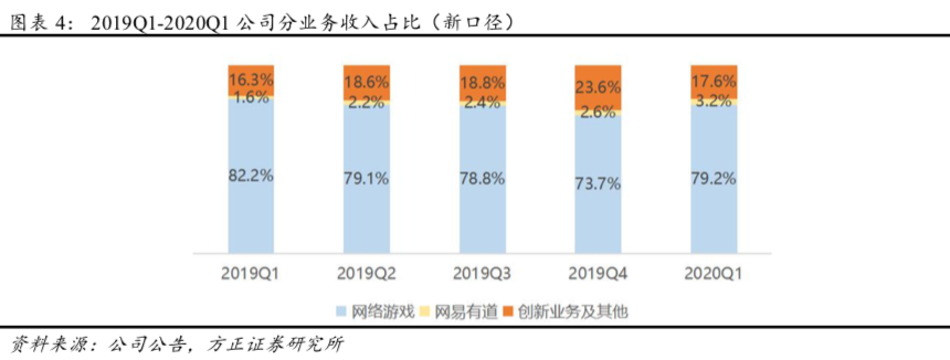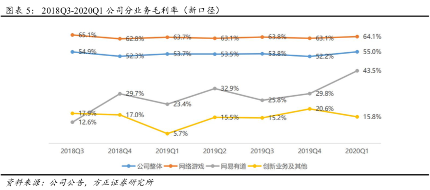 ①分业务收入:2020Q1公司实现网络游戏业务收入135.18亿元(YoY+14.1%、QoQ+16.5%),营收占比为79.2%(YoY-2.9pct、QoQ+5.5pct),游戏业务显著增长主要得益于公司多元化游戏组合的强劲生命力;网易有道收入5.41亿元(YoY+139.8%,QoQ+31.9%),营收占比为3.2%(YoY+1.6pct,QoQ+0.6pct),增长主要得益于学习服务和产品净收入增长;创新业务及其他收入30.02亿(YoY+28.0%,QoQ-19.3%),营收占比为17.6%(YoY+1.3pct,QoQ-6.0pct),创新业务收入持续增长主要是由于隶属于该板块的网易云音乐、网易严选等业务发展势头良好。