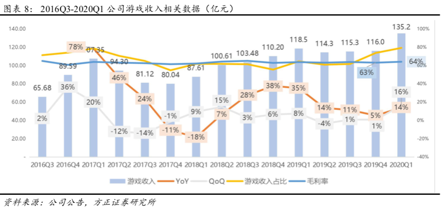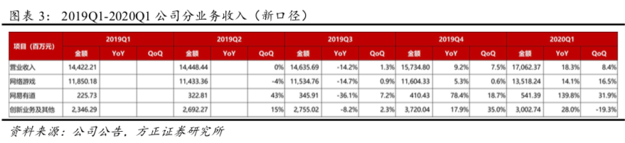 (1)分业务收入:20Q1公司实现网络游戏业务收入135.18亿元(YoY+14.1%、QoQ+16.5%);网易有道收入5.41亿元(YoY+139.8%,QoQ+31.9%);创新业务及其他收入30.02亿(YoY+28.0%,QoQ-19.3%)。