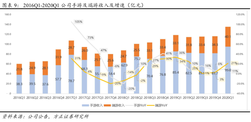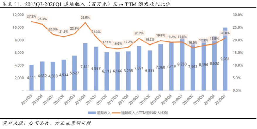 20Q1公司实现游戏收入135.18亿元(YoY+14.1%、QoQ+16.5%),收入占比为79.2%,其中手游收入95.0亿元(YoY+11%),端游收入40.1亿元(YoY+21%)。20Q1公司手游收入占中国手游总体收入比例为17.2%,同比下降1.2个百分点。20Q1公司递延收入为99.81亿元,创历史新高,占TTM游戏收入的比例为20.8%。