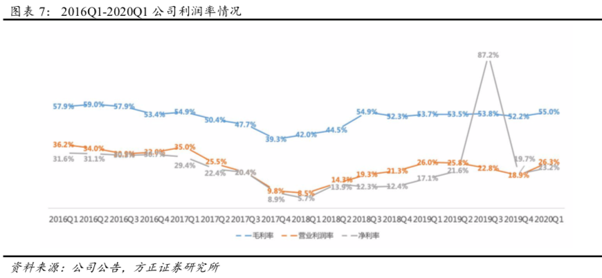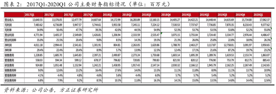 (4)利润率情况:20Q1公司毛利率为55.0%(YoY+1.3pct,QoQ+2.8pct),营业利润率26.3%(YoY+0.3pct,QoQ+7.4pct),净利率23.2%(YoY+6.1%,QoQ+3.5pct)。