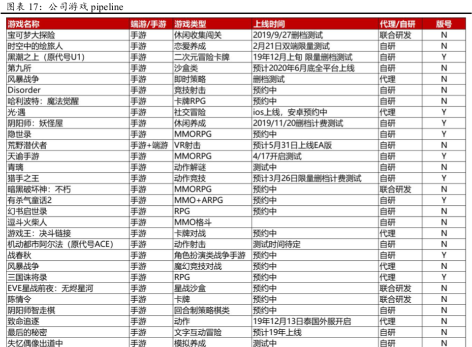 公司将在近期发布的游戏新品包括《梦幻西游h5》、《猎手之王》、《实况球会经理》和《阴阳师:妖怪屋》等游戏。其他将推出的新品还包括:《哈利波特:魔法觉醒》、《星战前夜:无烬星河》、《倩女幽魂隐世录》、《天谕》手游、《暗黑破坏神:不朽》、《宝可梦大探险》和《漫威对决》等。