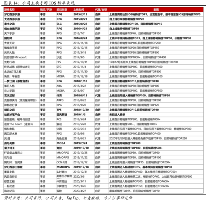 (1)国内手游:①手游的长线运营叠加多元创新,表现稳定:以《梦幻西游》(上线5年/稳定在IOS游戏畅销榜TOP5)、《大话西游》(上线4年多/稳定在IOS游戏畅销榜TOP20)、《率土之滨》(上线4年多/目前位居IOS游戏畅销榜TOP15)等为代表的旗舰手游始终保持强劲表现。②国内手游上线进度放缓,但公司产品储备丰富多元,多款游戏将于近期发布,有望带来收入增速继续回升:《梦幻西游三维版》(19年12月上线/20Q1稳居IOS游戏畅销榜TOP20)、《海岛纪元》(4月上线/首周IOS游戏畅销榜TOP25、稳居TOP70)、《风云岛行动》(3月上线/首周IOS游戏畅销榜TOP60、稳居TOP150)。公司将在近期发布的游戏有:《梦幻西游h5》、《猎手之王》、《实况球会经理》和《阴阳师:妖怪屋》等。其他储备新品还包括:《哈利波特:魔法觉醒》、《星战前夜:无烬星河》、《倩女幽魂隐世录》(已获版号/TapTap评分9.1)、《天谕》手游(已获版号/TapTap评分8.8)、《暗黑破坏神:不朽》、《宝可梦大探险》和《漫威对决》等。