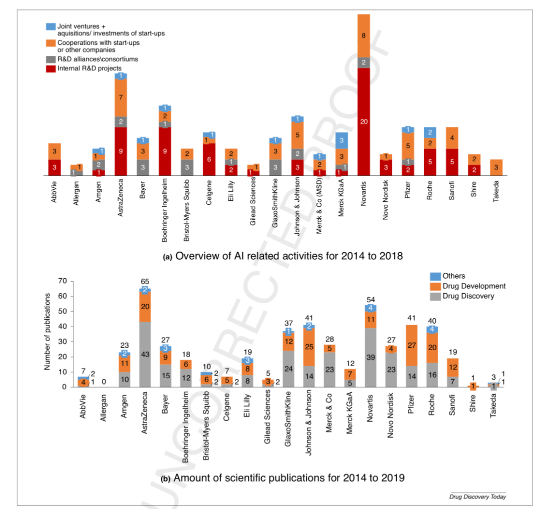 除了发表论文外,21家制药企业的探索还包括启动73项内部AI研发项目,61项与外部AI公司合作项目,11项投资/收购初创AI企业,还成立了7个AI研究联盟或协会以及2个合资公司。