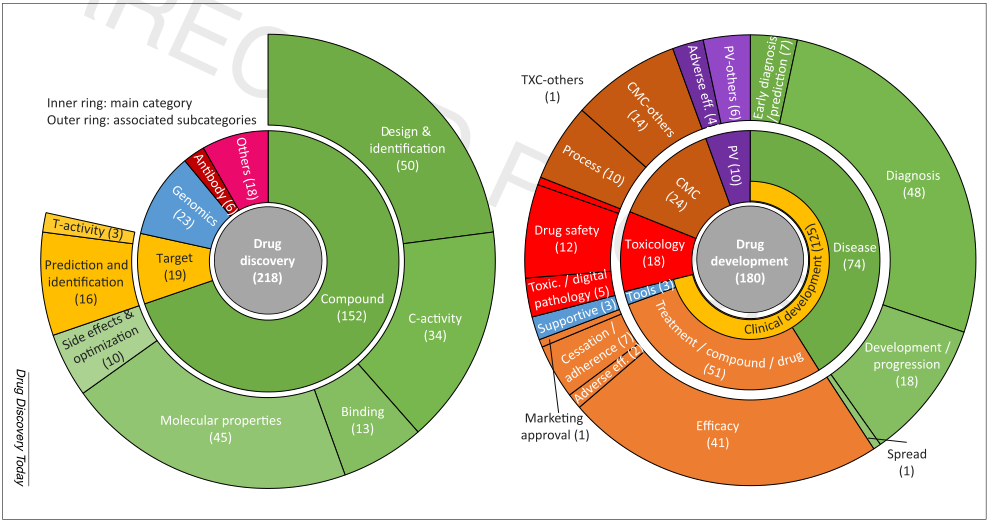 对2018年总收入排在前21位的制药企业发表的文献资料进行统计分析后发现,这21家药企在2014~2019年间共发表了398篇与“AI新药研发”相关的论文,其中218篇文章与药物发现相关,主题涉及化合物(152篇)、基因组学(23篇)、靶点(19篇)和抗体(6篇)。还有180篇与药物开发相关,涉及临床开发(125篇)、化学生产和质量控制(CMC,24篇)、毒理学(18)和药物安全警戒(PV,10篇)。