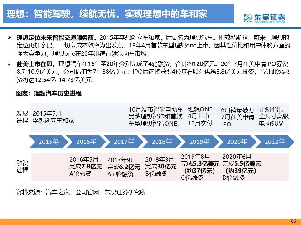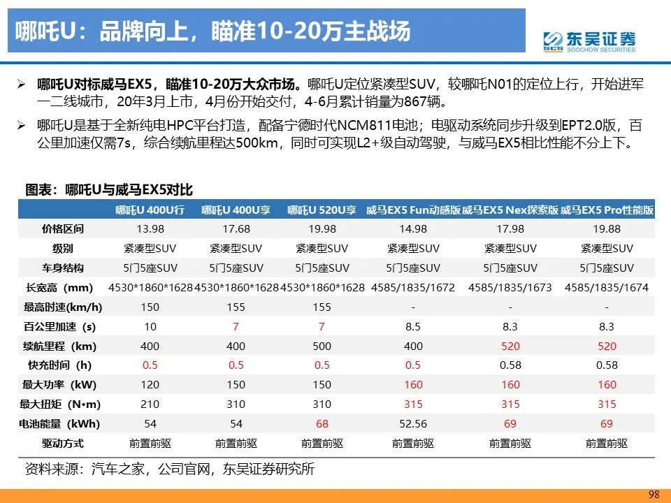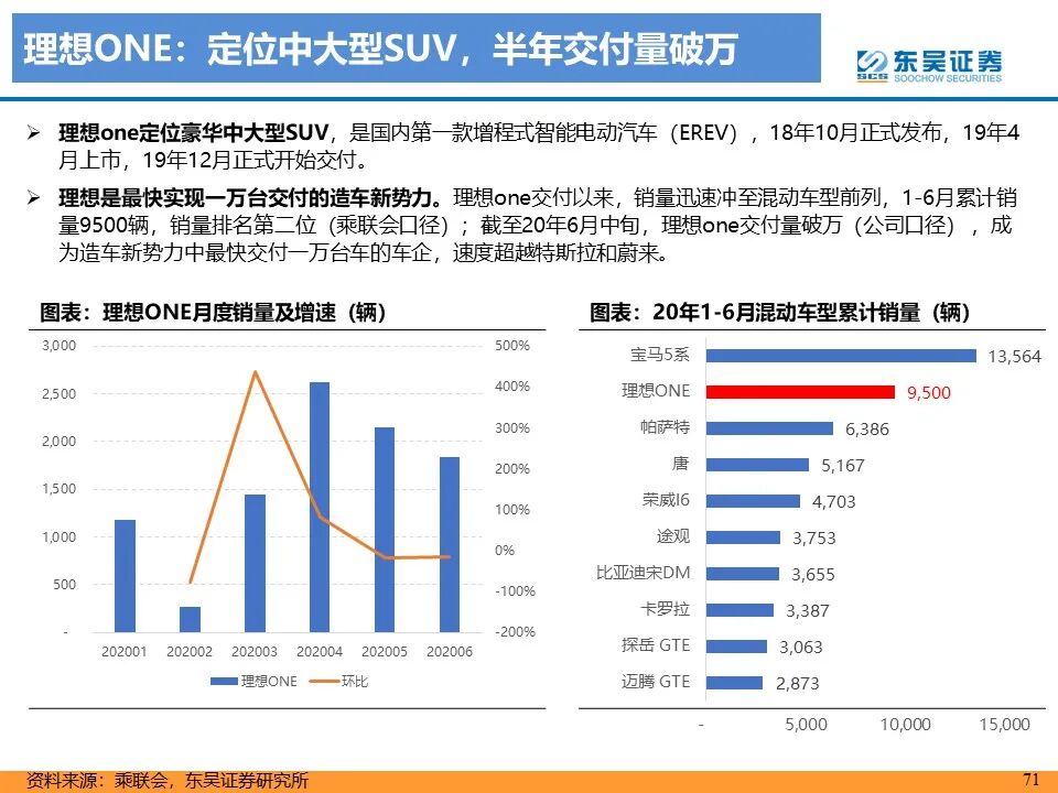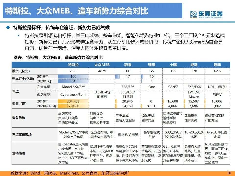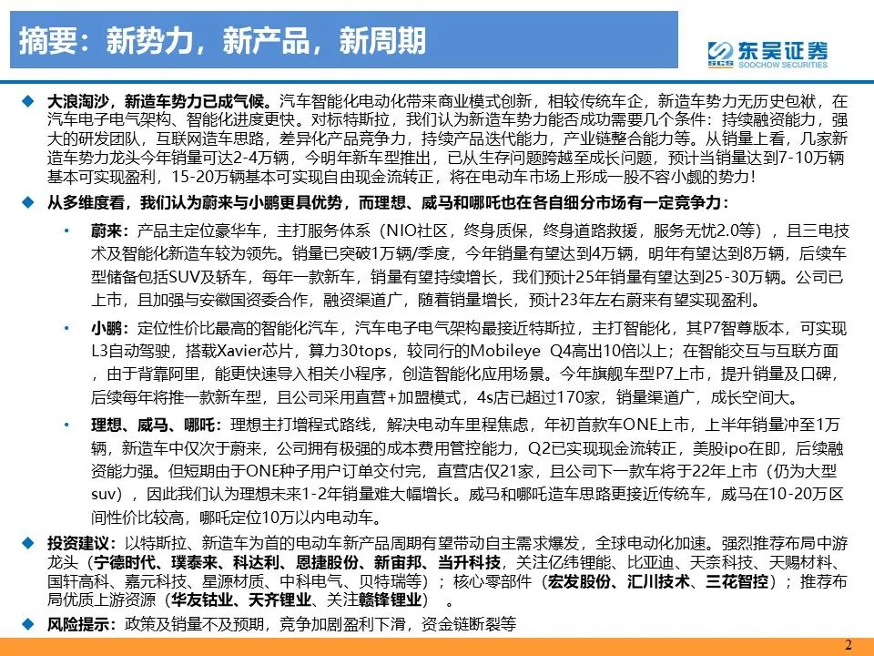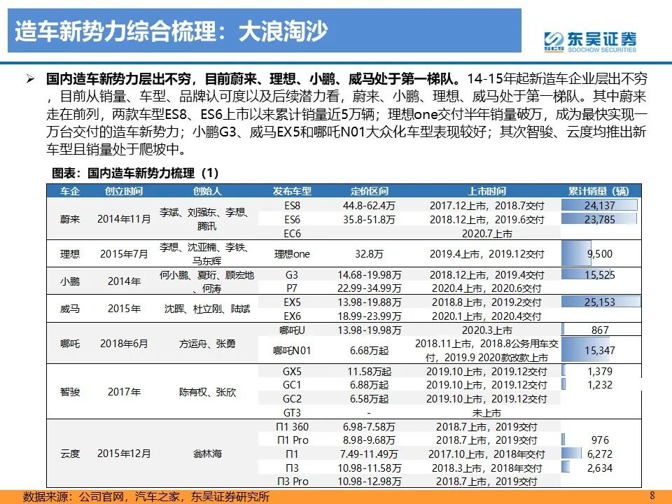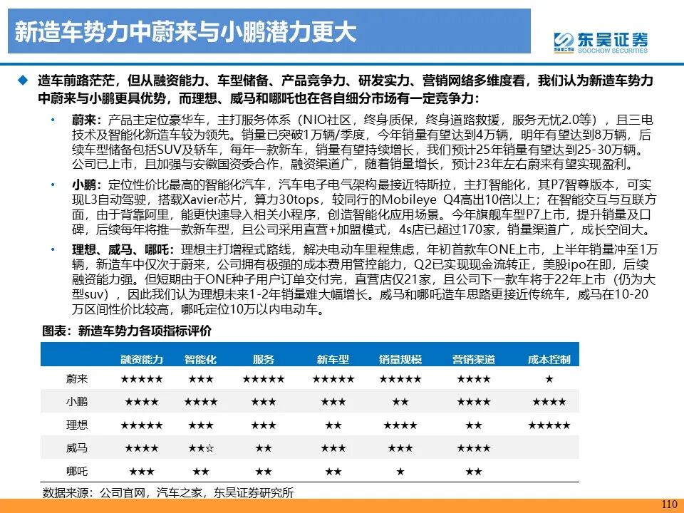 ·理想、威马、哪吒:理想主打增程式路线,解决电动车里程焦虑,年初首款车ONE上市,上半年销量冲至1万辆,新造车中仅次于蔚来,公司拥有极强的成本费用管控能力,Q2已实现现金流转正,美股ipo在即,后续融资能力强。但短期由于ONE种子用户订单交付完,直营店仅21家,且公司下一款车将于22年上市(仍为大型suv),因此我们认为理想未来1-2年销量难大幅增长。威马和哪吒造车思路更接近传统车,威马在10-20万区间性价比较高,哪吒定位10万以内电动车。