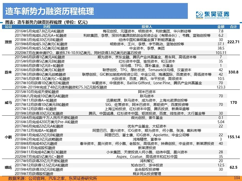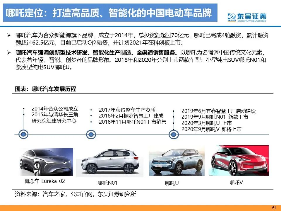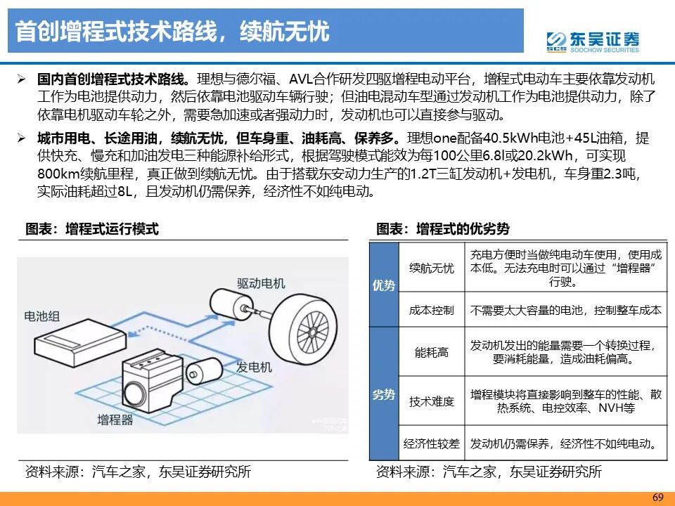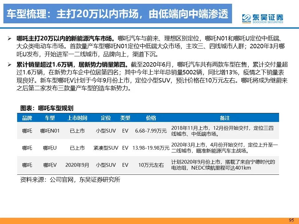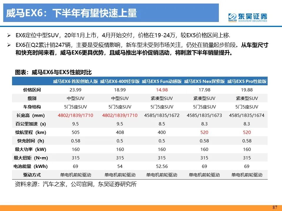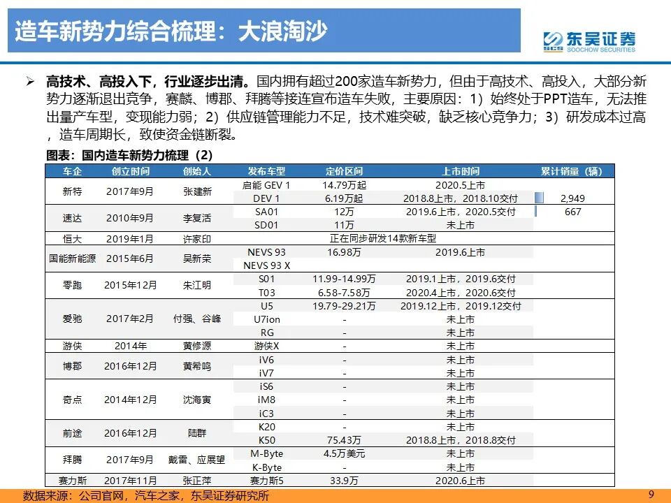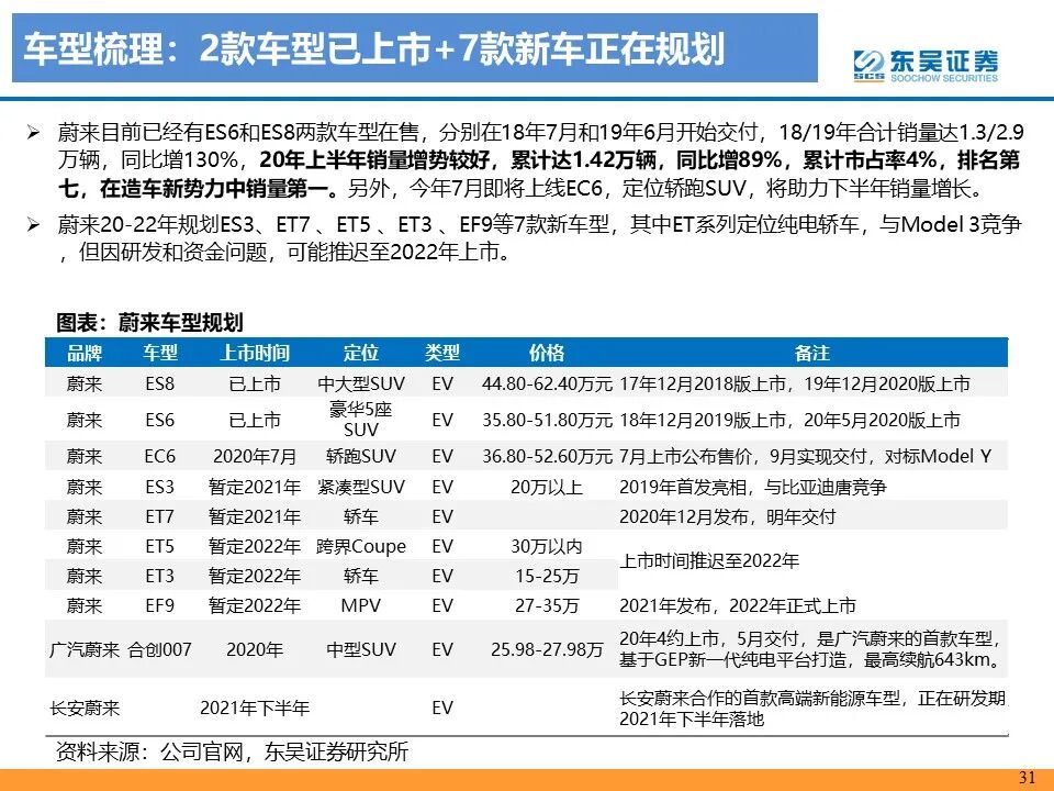 ·理想、威马、哪吒:理想主打增程式路线,解决电动车里程焦虑,年初首款车ONE上市,上半年销量冲至1万辆,新造车中仅次于蔚来,公司拥有极强的成本费用管控能力,Q2已实现现金流转正,美股ipo在即,后续融资能力强。但短期由于ONE种子用户订单交付完,直营店仅21家,且公司下一款车将于22年上市(仍为大型suv),因此我们认为理想未来1-2年销量难大幅增长。威马和哪吒造车思路更接近传统车,威马在10-20万区间性价比较高,哪吒定位10万以内电动车。