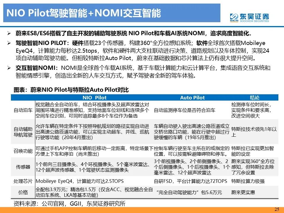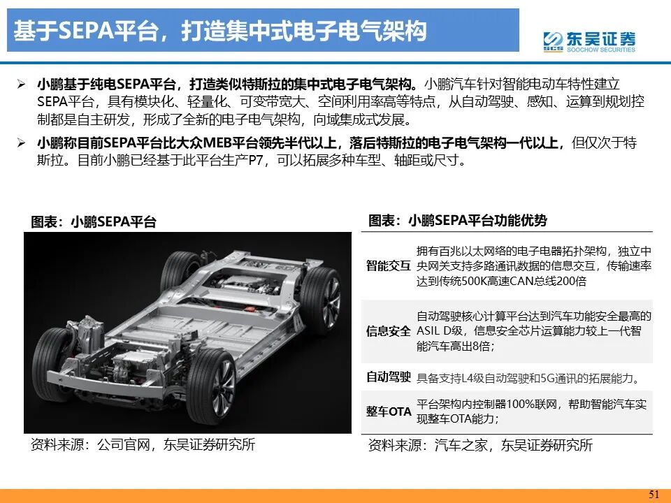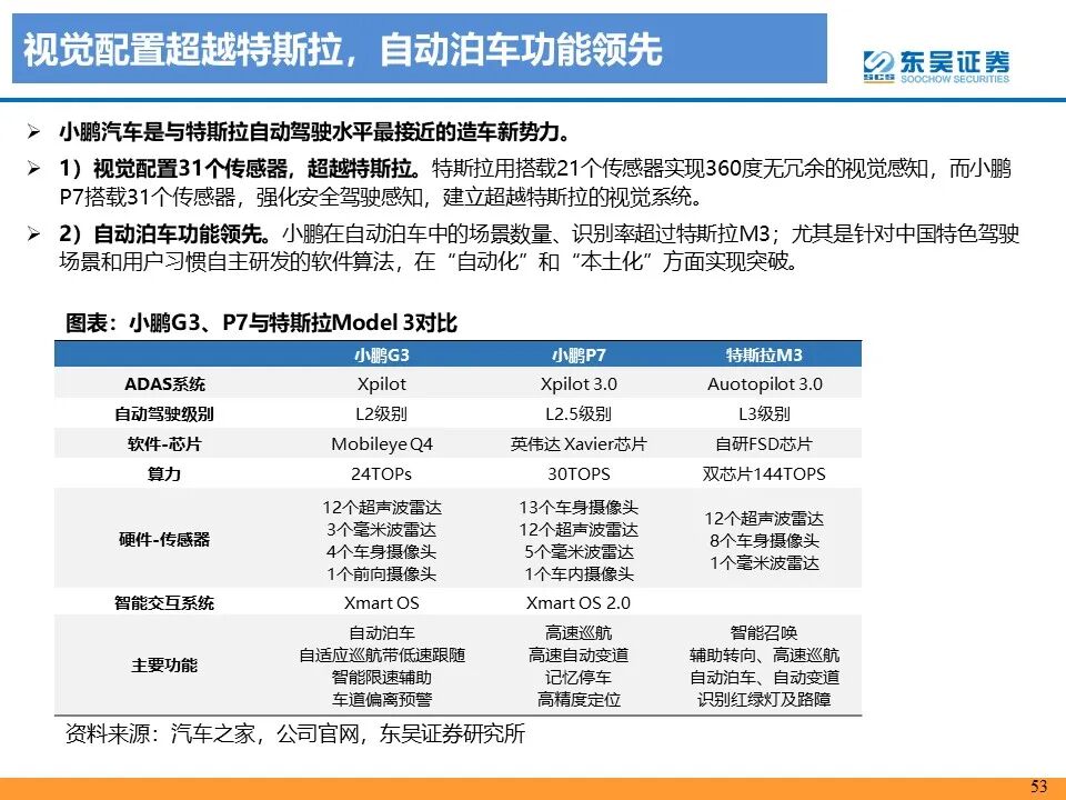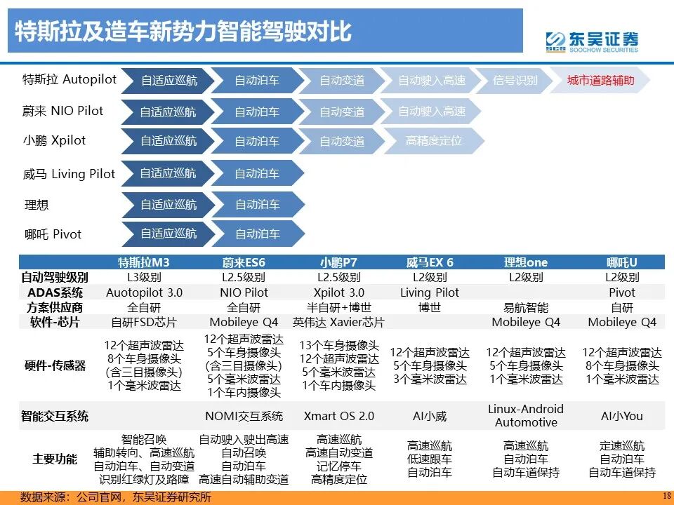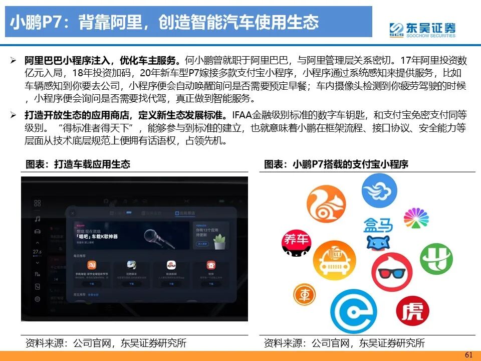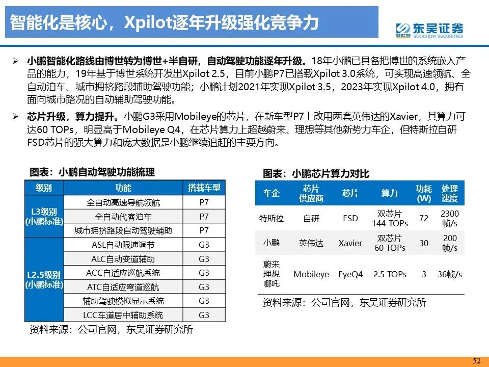 ·小鹏:定位性价比最高的智能化汽车,汽车电子电气架构最接近特斯拉,主打智能化,其P7智尊版本,可实现L3自动驾驶,搭载Xavier芯片,算力30tops,较同行的MobileyeQ4高出10倍以上;在智能交互与互联方面,由于背靠阿里(09988),能更快速导入相关小程序,创造智能化应用场景。今年旗舰车型P7上市,提升销量及口碑,后续每年将推一款新车型,且公司采用直营+加盟模式,4s店已超过170家,销量渠道广,成长空间大。