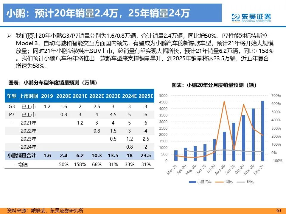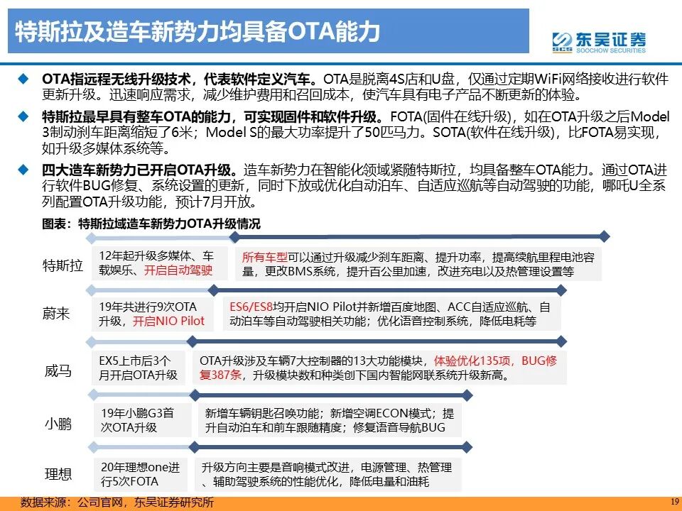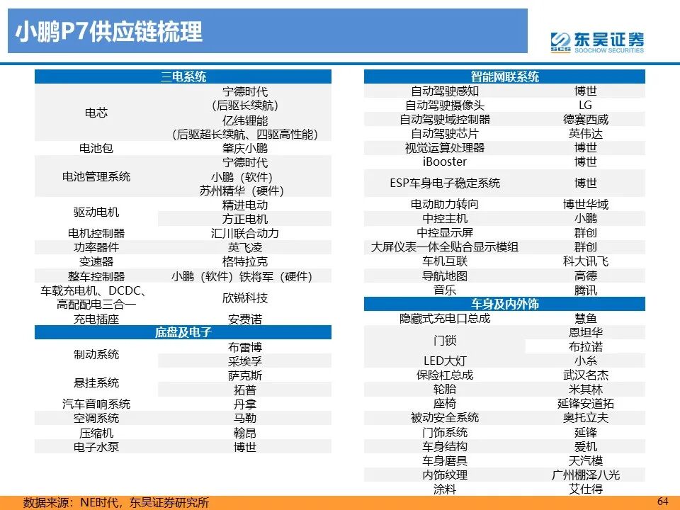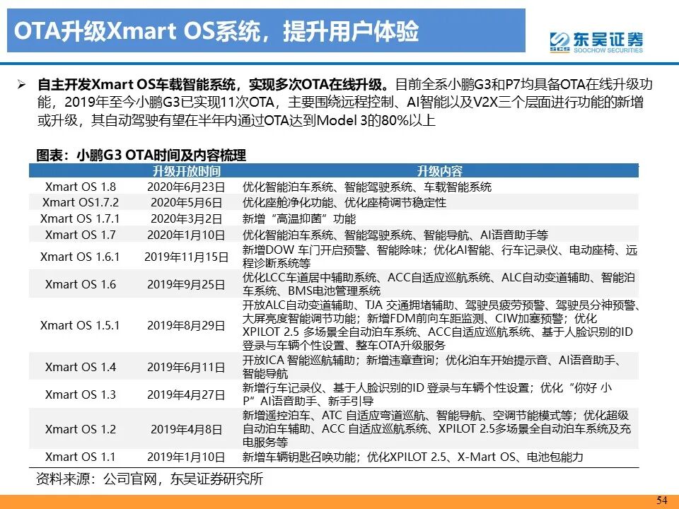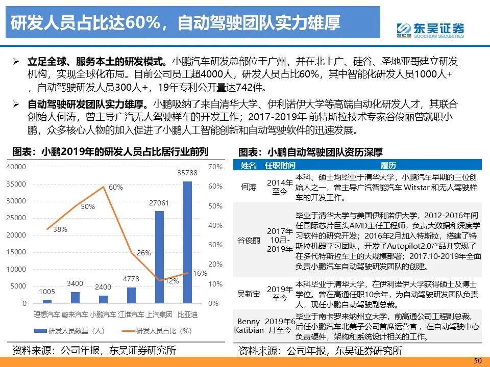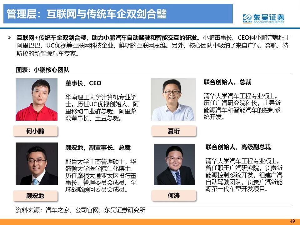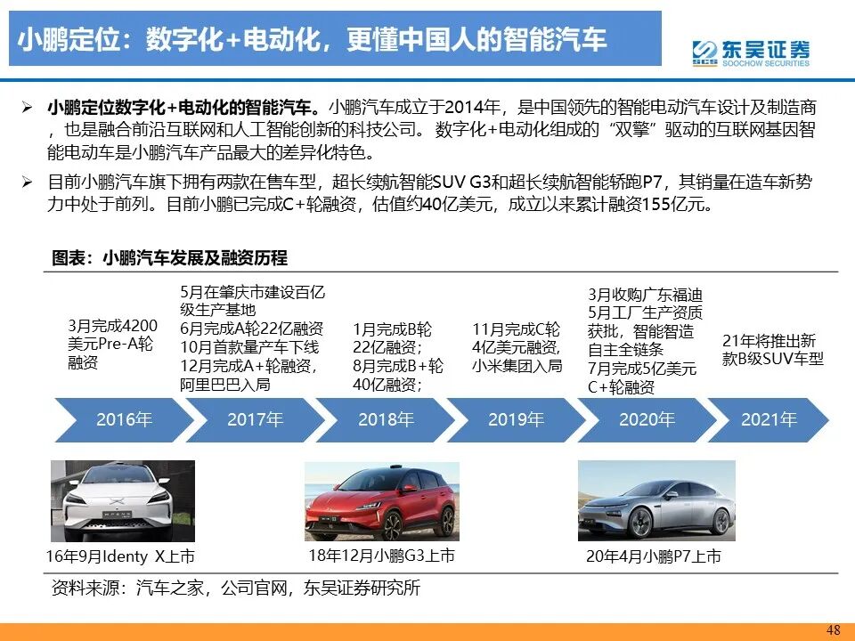 ·小鹏:定位性价比最高的智能化汽车,汽车电子电气架构最接近特斯拉,主打智能化,其P7智尊版本,可实现L3自动驾驶,搭载Xavier芯片,算力30tops,较同行的MobileyeQ4高出10倍以上;在智能交互与互联方面,由于背靠阿里(09988),能更快速导入相关小程序,创造智能化应用场景。今年旗舰车型P7上市,提升销量及口碑,后续每年将推一款新车型,且公司采用直营+加盟模式,4s店已超过170家,销量渠道广,成长空间大。
