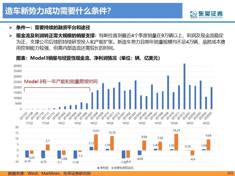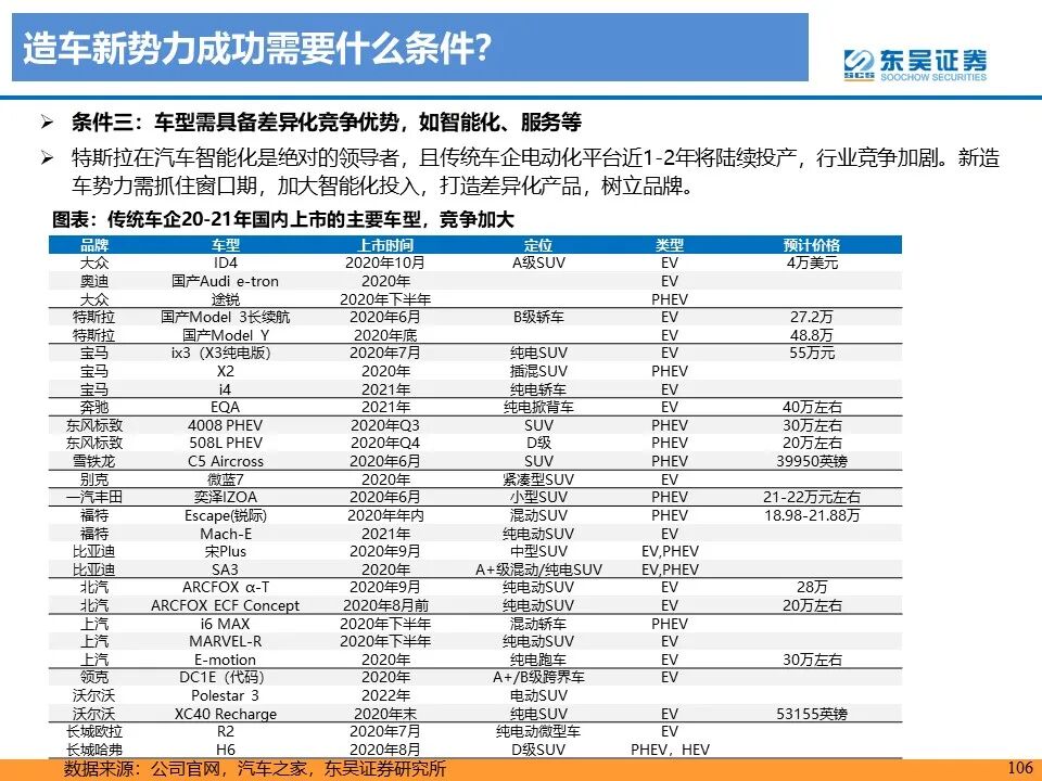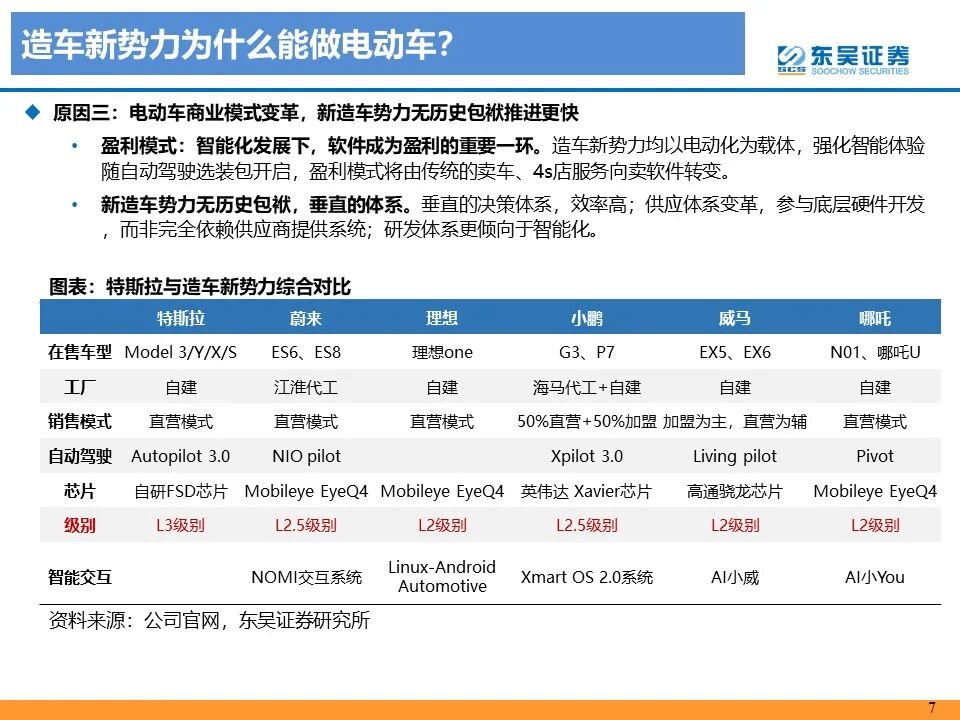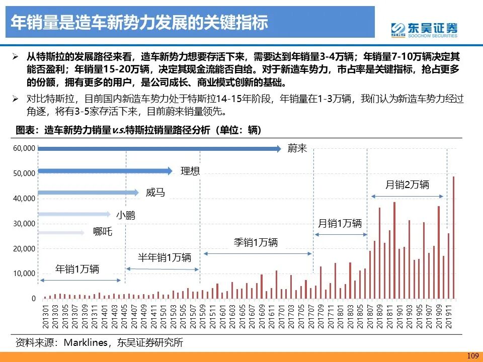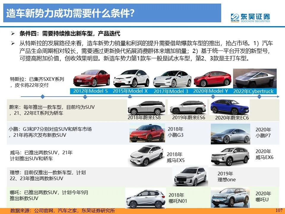 大浪淘沙,新造车势力已成气候。汽车智能化电动化带来商业模式创新,相较传统车企,新造车势力无历史包袱,在汽车电子电气架构、智能化进度更快。对标特斯拉(TSLA.US),我们认为新造车势力能否成功需要几个条件:持续融资能力,强大的研发团队,互联网造车思路,差异化产品竞争力,持续产品迭代能力,产业链整合能力等。从销量上看,几家新造车势力龙头今年销量可达2-4万辆,今明年新车型推出,已从生存问题跨越至成长问题,预计当销量达到7-10万辆基本可实现盈利,15-20万辆基本可实现自由现金流转正,将在电动车市场上形成一股不容小觑的势力!