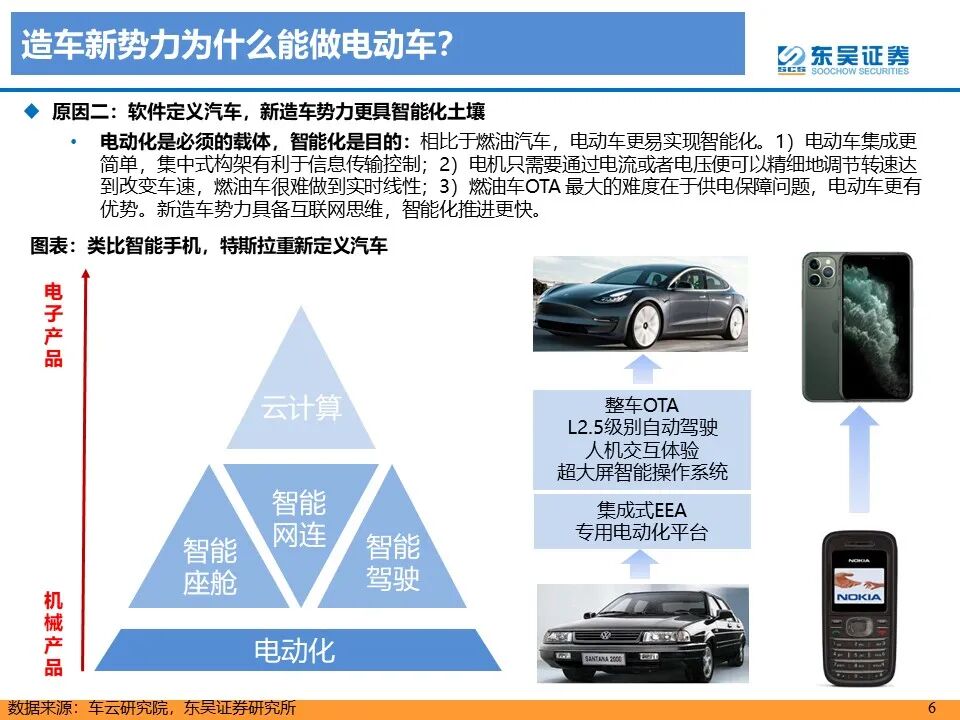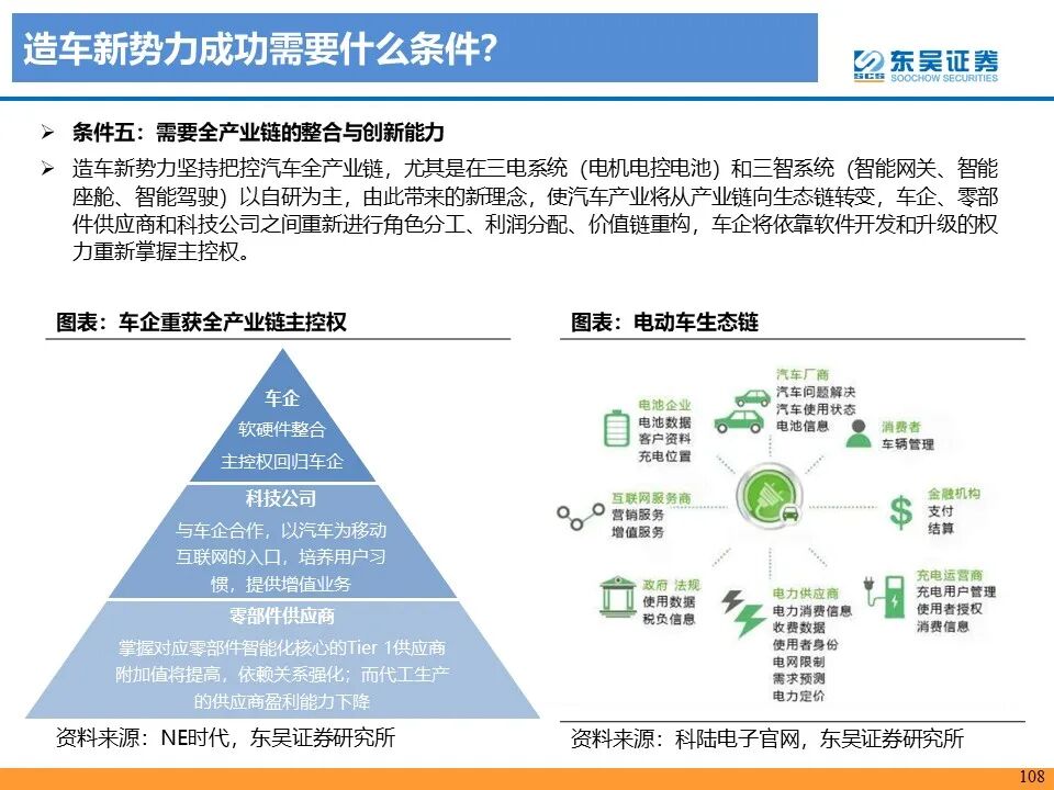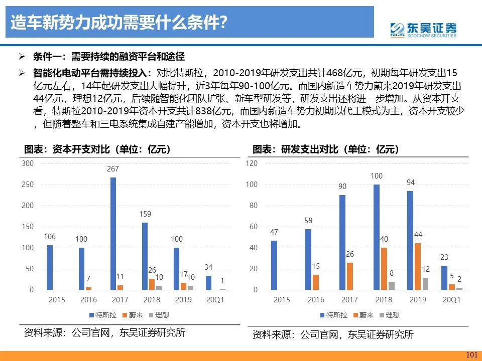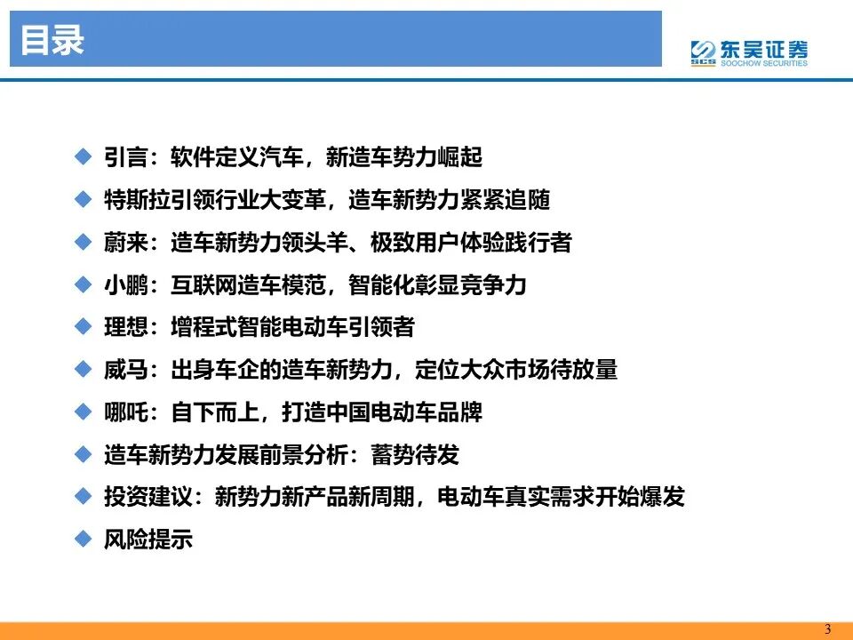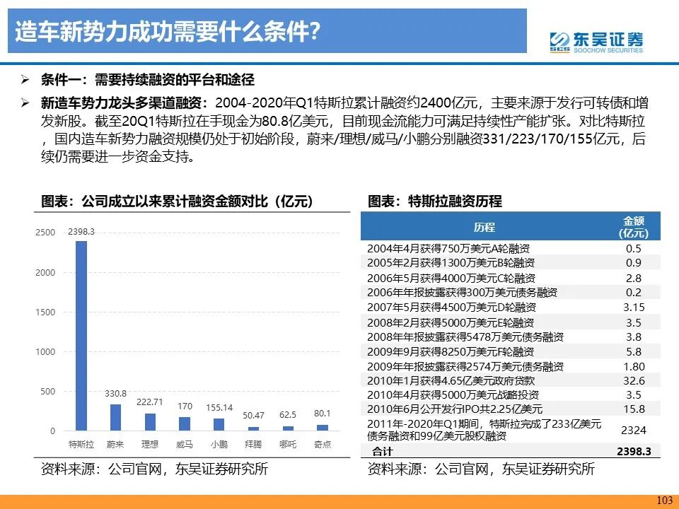 大浪淘沙,新造车势力已成气候。汽车智能化电动化带来商业模式创新,相较传统车企,新造车势力无历史包袱,在汽车电子电气架构、智能化进度更快。对标特斯拉(TSLA.US),我们认为新造车势力能否成功需要几个条件:持续融资能力,强大的研发团队,互联网造车思路,差异化产品竞争力,持续产品迭代能力,产业链整合能力等。从销量上看,几家新造车势力龙头今年销量可达2-4万辆,今明年新车型推出,已从生存问题跨越至成长问题,预计当销量达到7-10万辆基本可实现盈利,15-20万辆基本可实现自由现金流转正,将在电动车市场上形成一股不容小觑的势力!