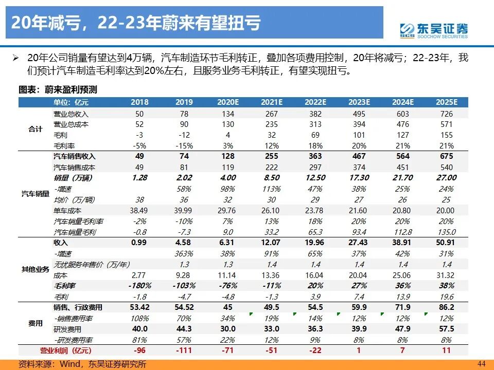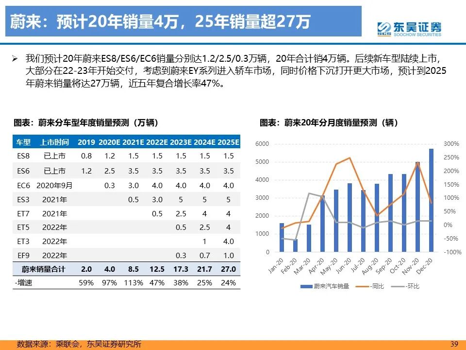 ·蔚来:产品主定位豪华车,主打服务体系(NIO社区,终身质保,终身道路救援,服务无忧2.0等),且三电技术及智能化新造车较为领先。销量已突破1万辆/季度,今年销量有望达到4万辆,明年有望达到8万辆,后续车型储备包括SUV及轿车,每年一款新车,销量有望持续增长,我们预计25年销量有望达到25-30万辆。公司已上市,且加强与安徽国资委合作,融资渠道广,随着销量增长,预计23年左右蔚来有望实现盈利。