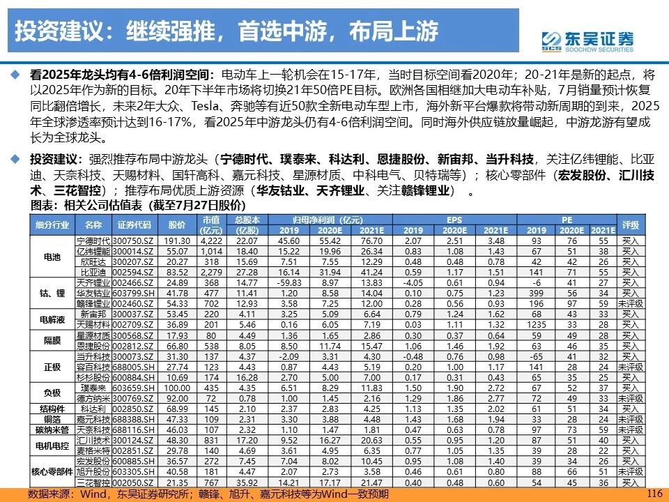 投资建议:以特斯拉、新造车为首的电动车新产品周期有望带动自主需求爆发,全球电动化加速。强烈推荐布局中游龙头:宁德时代、璞泰来、科达利、恩捷股份、新宙邦、当升科技,关注亿纬锂能、比亚迪(01211)、天奈科技、天赐材料、国轩高科、嘉元科技、星源材质、中科电气、贝特瑞等;核心零部件:宏发股份、汇川技术、三花智控;推荐布局优质上游资源:华友钴业、天齐锂业、关注赣锋锂业(01772) 。