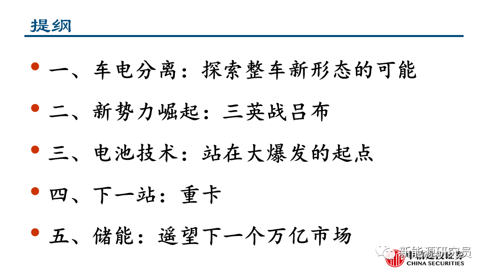 未来新能源汽车五大投资方向:车电分离、造车新势力、电池技术、重卡、储能。