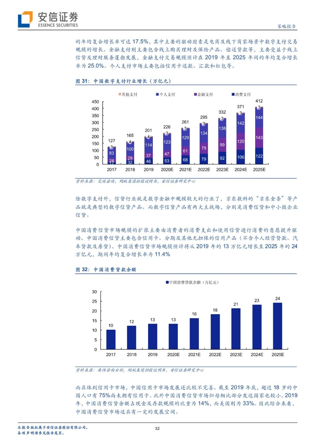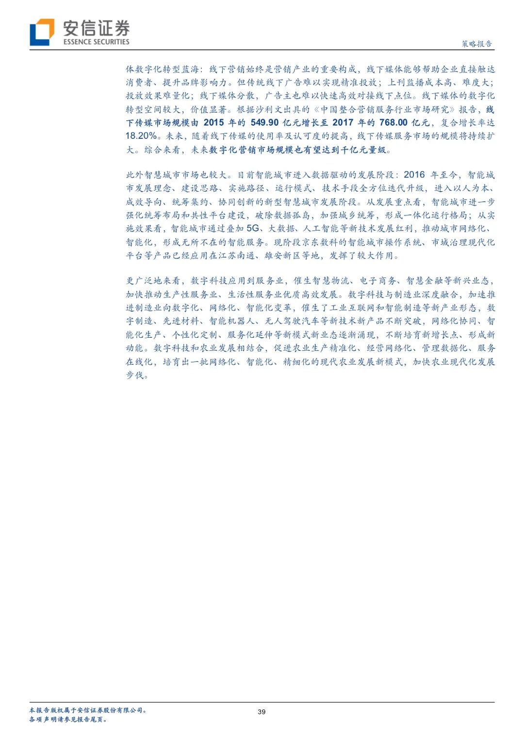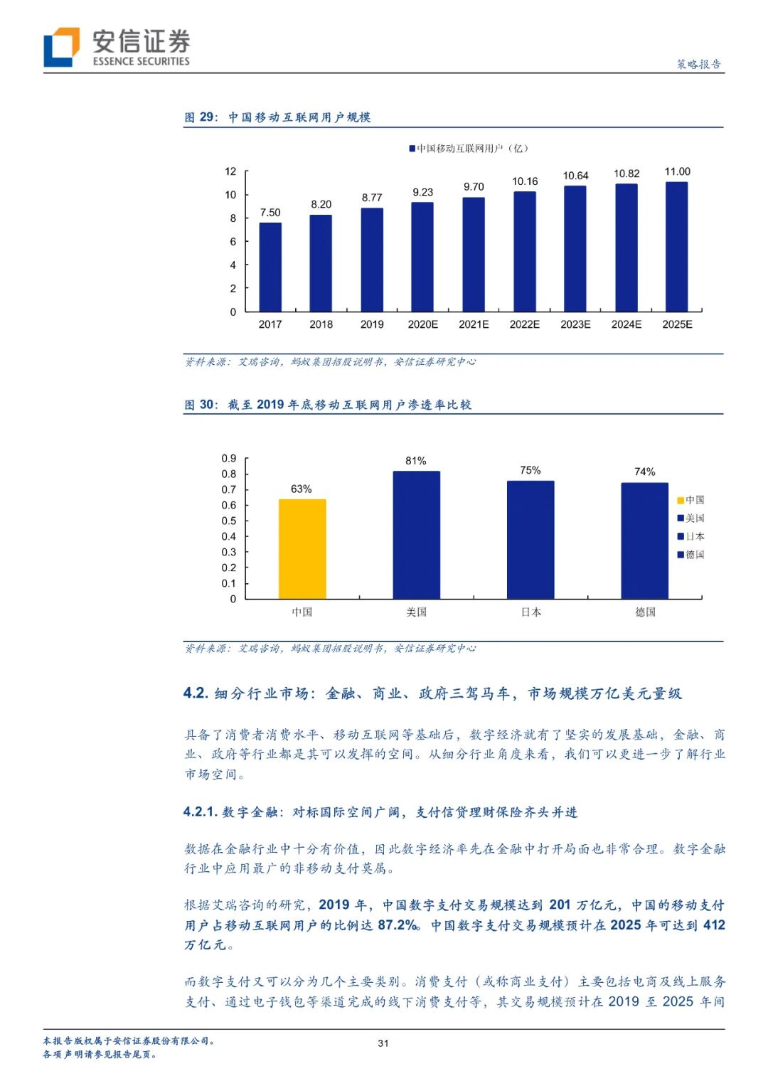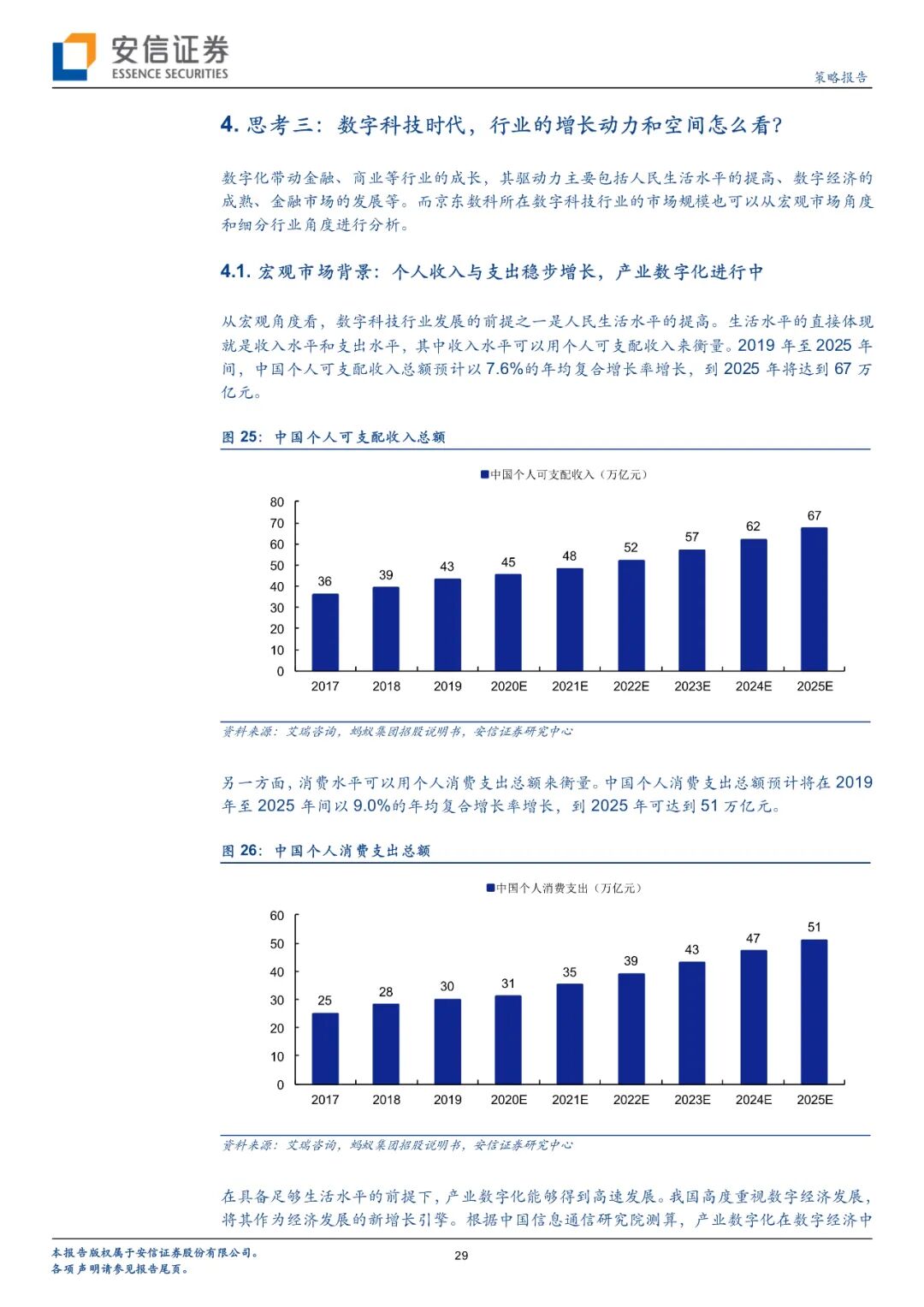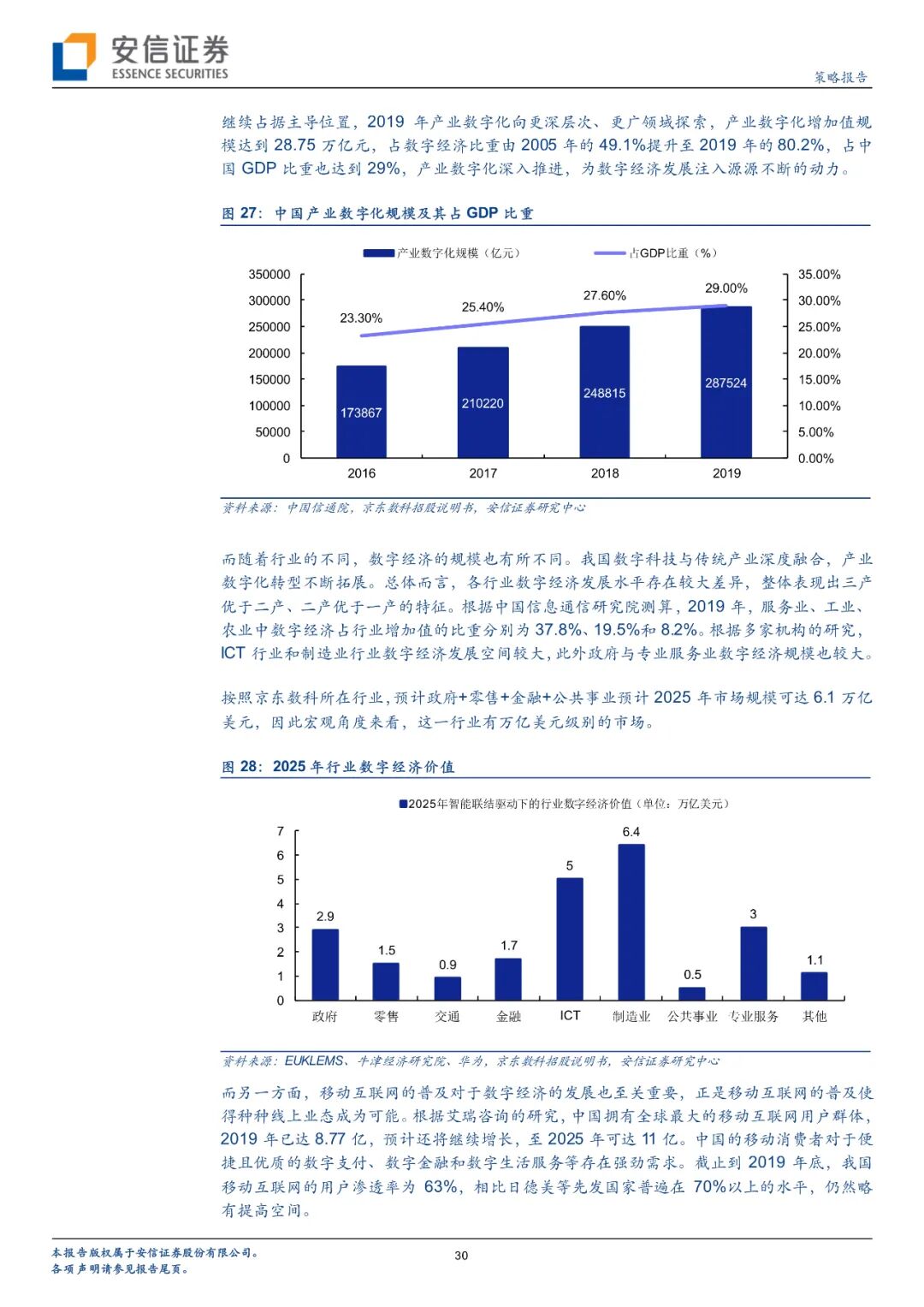 未来数字经济市场的发展与宏观经济条件和细分市场发展都有关系。宏观经济方面,2019中国个人可支配收入总额达到43万亿元,预计2025可达67万亿元;中国个人消费支出总额达到30万亿元,预计2025可达51万亿元;中国移动互联网用户规模已达8.77亿人,渗透率达到63%,还有一定提升空间。以上条件为数字经济发展提供了较好的基础,据测算2019年中国产业数字化规模已达28.75万亿元,占GDP比例已达29%,且处于持续上升状态。细分行业方面,预计2019-2025数字支付市场复合增长率将达到11.4%,交易规模预计可达412万亿元;在线消费信贷复合增长率将达到20.4%,市场规模预计可达19万亿元;中小微企业在线信贷增速预计为40.8%,市场规模预计可达16万亿元;在线理财市场增速预计为21.6%,市场规模预计可达69万亿元;在线保险市场增速预计为38.1%,市场规模预计可达1.9万亿元。京东数科这一类数字化企业将从诸多金融业务庞大的市场规模中收取一定比例的服务费等。此外商户与企业数字化市场从2015年的179.4亿元发展到2019年已超过千亿规模;线下传媒市场规模从2015年的549.90亿元发展到2017年已达768亿元,政府与智慧城市等业务也将快速发展。