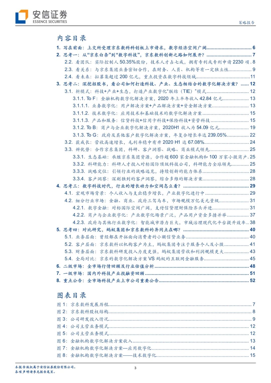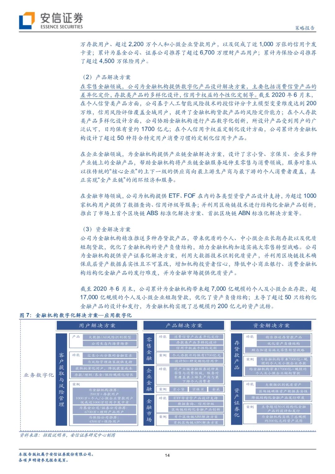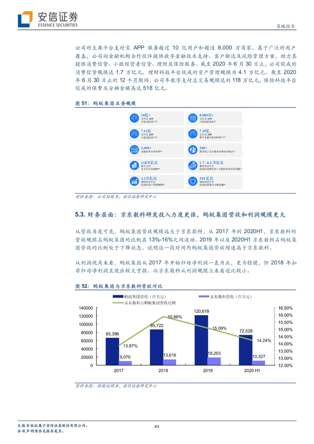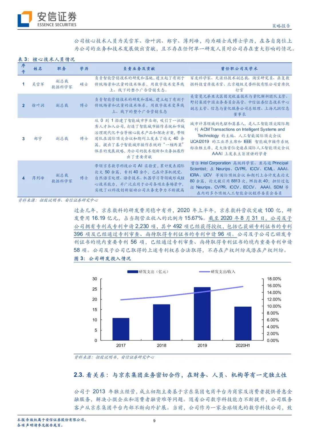 京东数科成立仅7年,目前与京东集团保持着密切的业务联系,但二者在财务、人员、机构方面高度独立。京东数科经历了数字金融、金融科技和数字科技三个阶段。截至2020年6月末,京东数科已经在金融机构服务领域服务了600家以上的公司,在商户与企业服务领域服务了超过100万家小微商户、超20万家中小企业、超700家大型商业中心,此外还服务了超40家城市公共服务机构,建立了庞大的线下物联网营销平台,覆盖超过300座城市。目前公司5名高管均来自其他公司高级管理层,截至2020年6月30日,公司共有9989名员工,其中6969人都是研发人员或专业人员,占比约70%。2020上半年,京东数科营收突破100亿元,研发费用16.19亿元,占比15.67%。公司积累了大量核心技术,截至2020年8月31日共拥有专利或正在申请2230项。目前京东数科计划科创板上市,预计募集资金金额超过200亿元,投向各类数字化解决方案升级建设项目、开放平台升级建设项目以及补充流动资金。整体来看,公司以创新驱动,实现了To F、To B、To G的全覆盖。