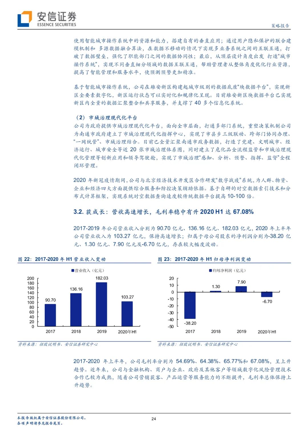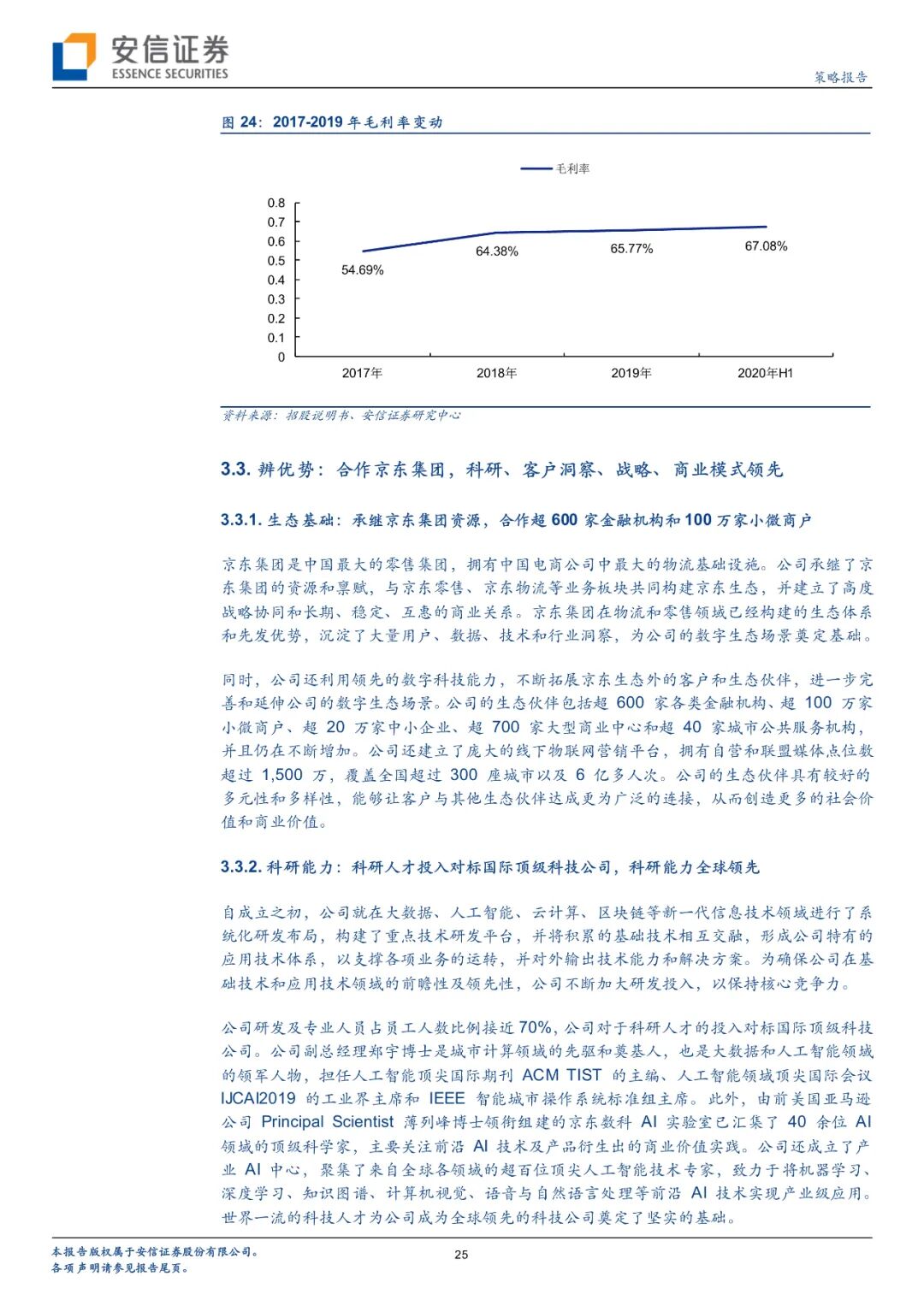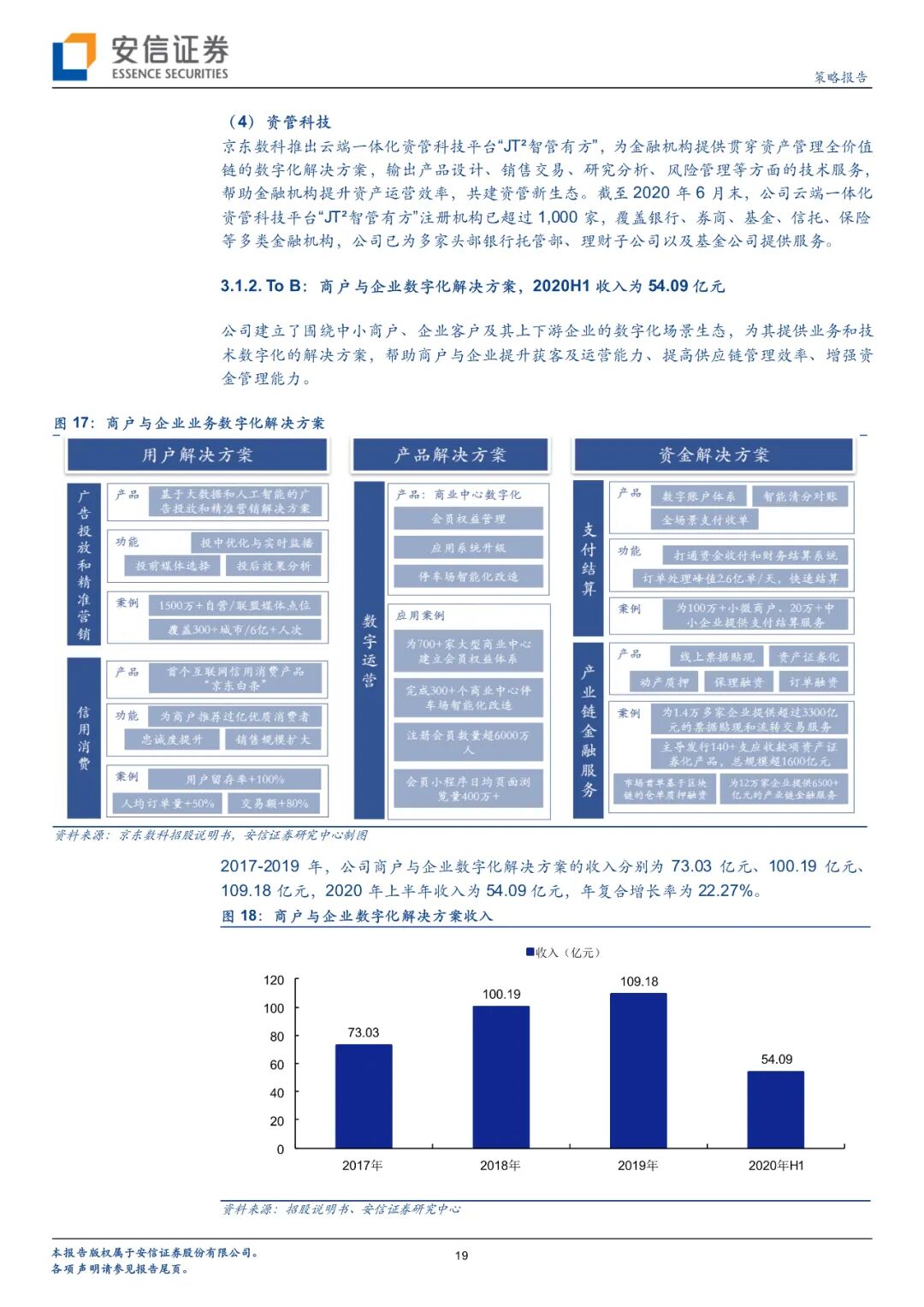 京东数科提出了科技(technology)+产业(industry)+生态(ecosystem)三者结合的产业数字化“TIE”模式,为客户提供全方位服务。公司已经逐渐形成to F(金融机构数字化)、to B(商户与企业数字化)、to G(政府与其他行业数字化)三大业务,每一类数字化解决方案都包含业务数字化、应用技术数字化、基础技术数字化三大层级。三大业务中,商户与企业业务占比最高,2020H1收入达到54.09亿元,占比52.37%,公司围绕中小商户、企业客户及其上下游企业提供商户与企业数字化解决方案,其中用户解决方案“京东白条”将商户的用户留存率提升约100%;政府及其他客户数字化业务增长最快,2017-2019年度营收复合增长率达到239.05%,2020H1收入5.75亿元,占比5.57%,向超过500家媒体主提供数字化管理服务,助力雄安新区“块数据”平台打造智能城市样板;金融机构业务重要性逐步提升,营收占比从2017年的17.05%稳步提升到2020H1的41.48%,2020H1营收42.84亿元,其中用户解决方案已为金融机构推荐了超200万存款用户、超2200万个人和小微企业贷款用户,促成了近1000万张信用卡发卡量,为基金公司、证券公司推荐了超6700万理财产品用户,为保险公司推荐了4500万保险用户;产品解决方案所设计产品受到用户广泛认可,日均保有量约1700亿元;资金解决方案累计为金融机构带来超7000亿规模的个人及小微企业存款,超17000亿规模的个人及小微企业短期贷款。从盈利能力角度来看,近年来京东数科毛利率一直稳中有升,到2020H1已达67.08%。