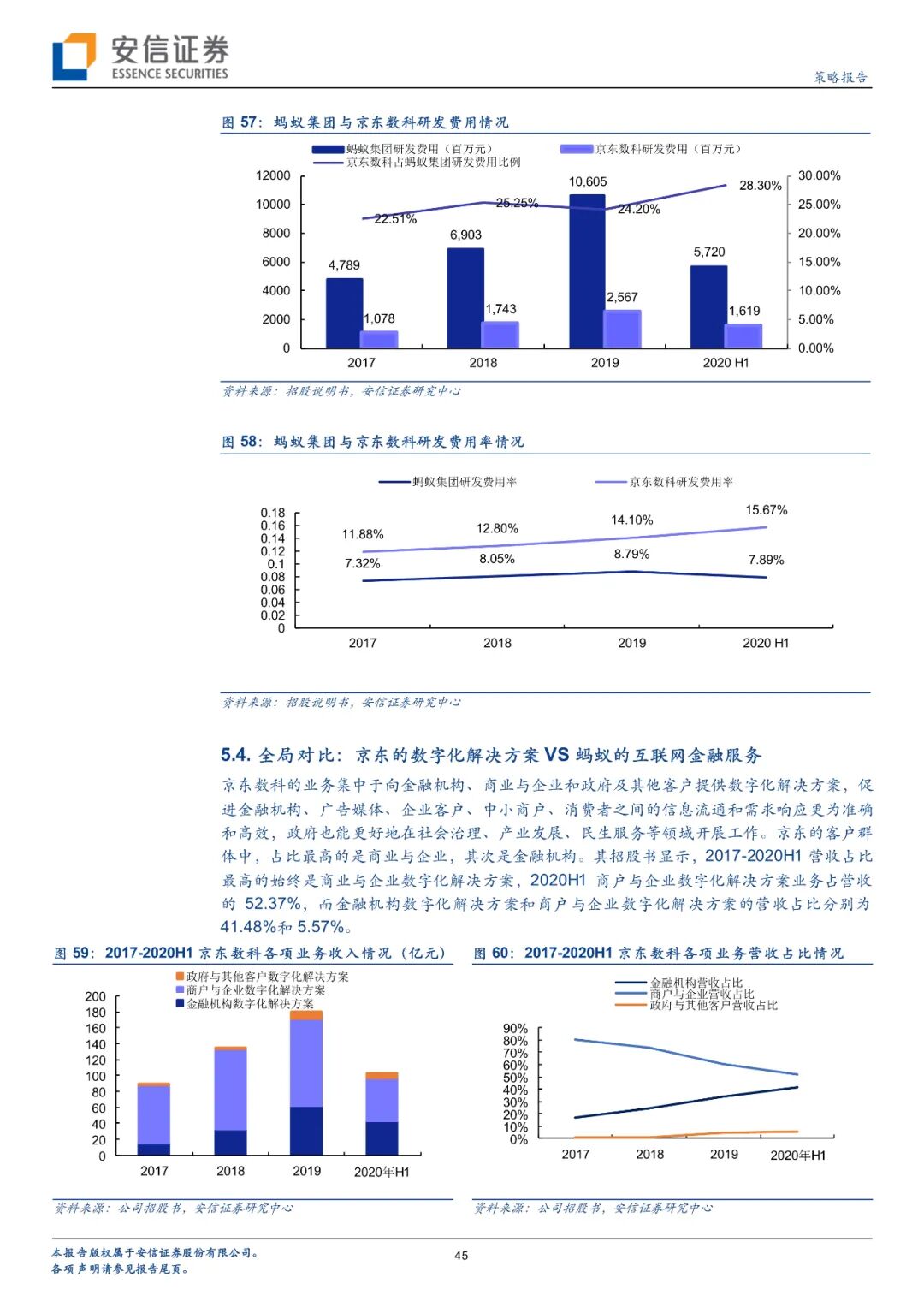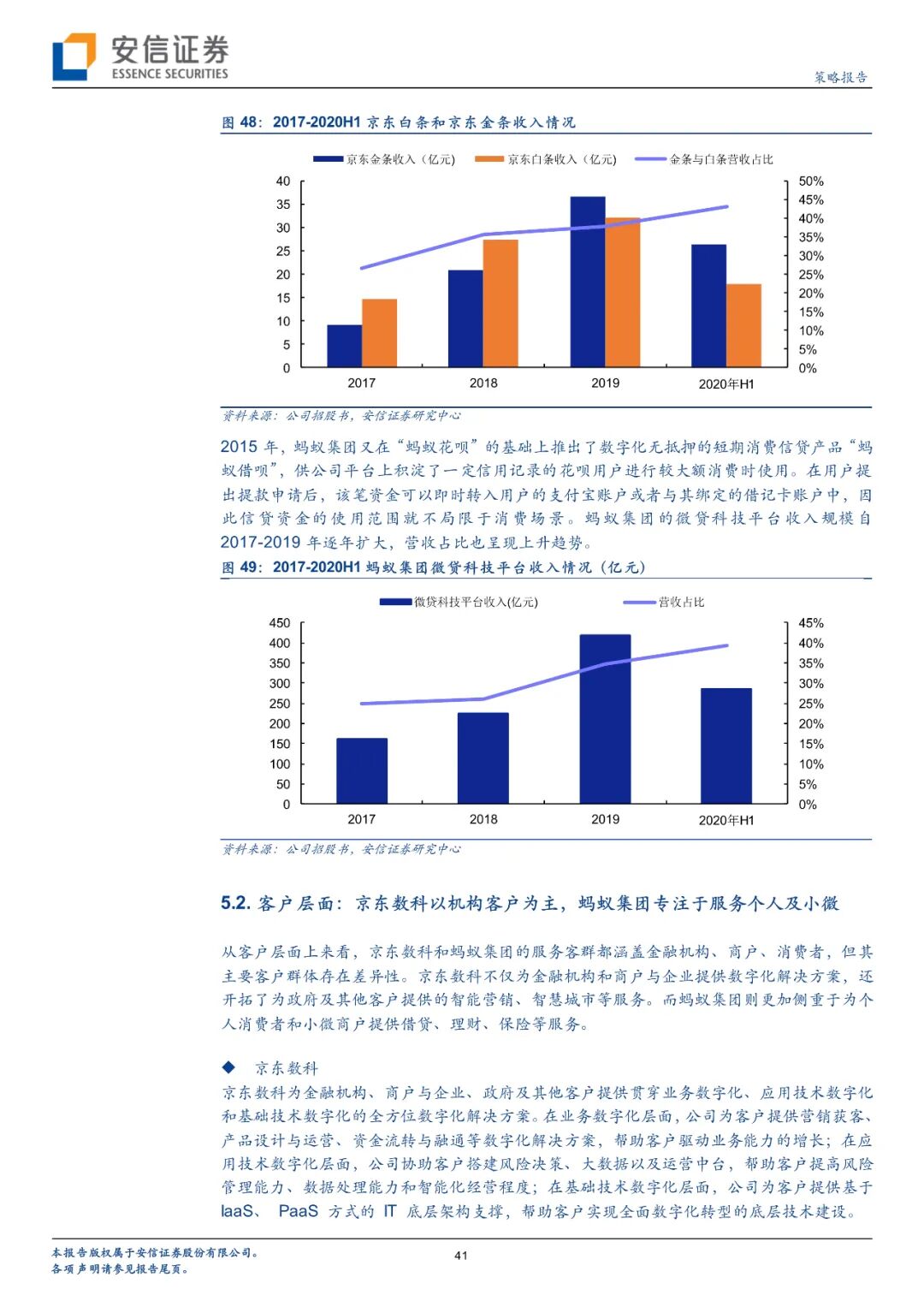 京东数科与蚂蚁集团的金融相关业务相似度较高,但各有特色。从业务层面来看,2014-2016年二者业务高度相似,都开拓了小额信贷业务,京东数科的“京东白条”、“京东金条”与蚂蚁集团的“蚂蚁花呗”、“蚂蚁借呗”高度相近。近年来二者的信贷业务也都取得了快速增长,京东数科的白条与金条业务收入从2017的23.93亿元提高到2019的68.70亿元;蚂蚁集团的微贷科技收入从2017的161.87亿元提高到了2019的418.85亿元。客户层面,京东数科以机构客户为主,为企业提供营销获客、产品运营、资金流转等数字化解决方案或数据中台、风控系统、IaaS、PaaS等技术支撑,也提供政府数字化服务;而蚂蚁集团客户更多是个人以及小微企业,以支付宝为核心,与金融机构进行合作,提供金融服务。财务层面,蚂蚁集团营收和利润规模都较大,京东数科研发费用率较高。目前京东数科业务仍然以商户和企业服务为主,而蚂蚁集团业务中金融科技平台占比最高。