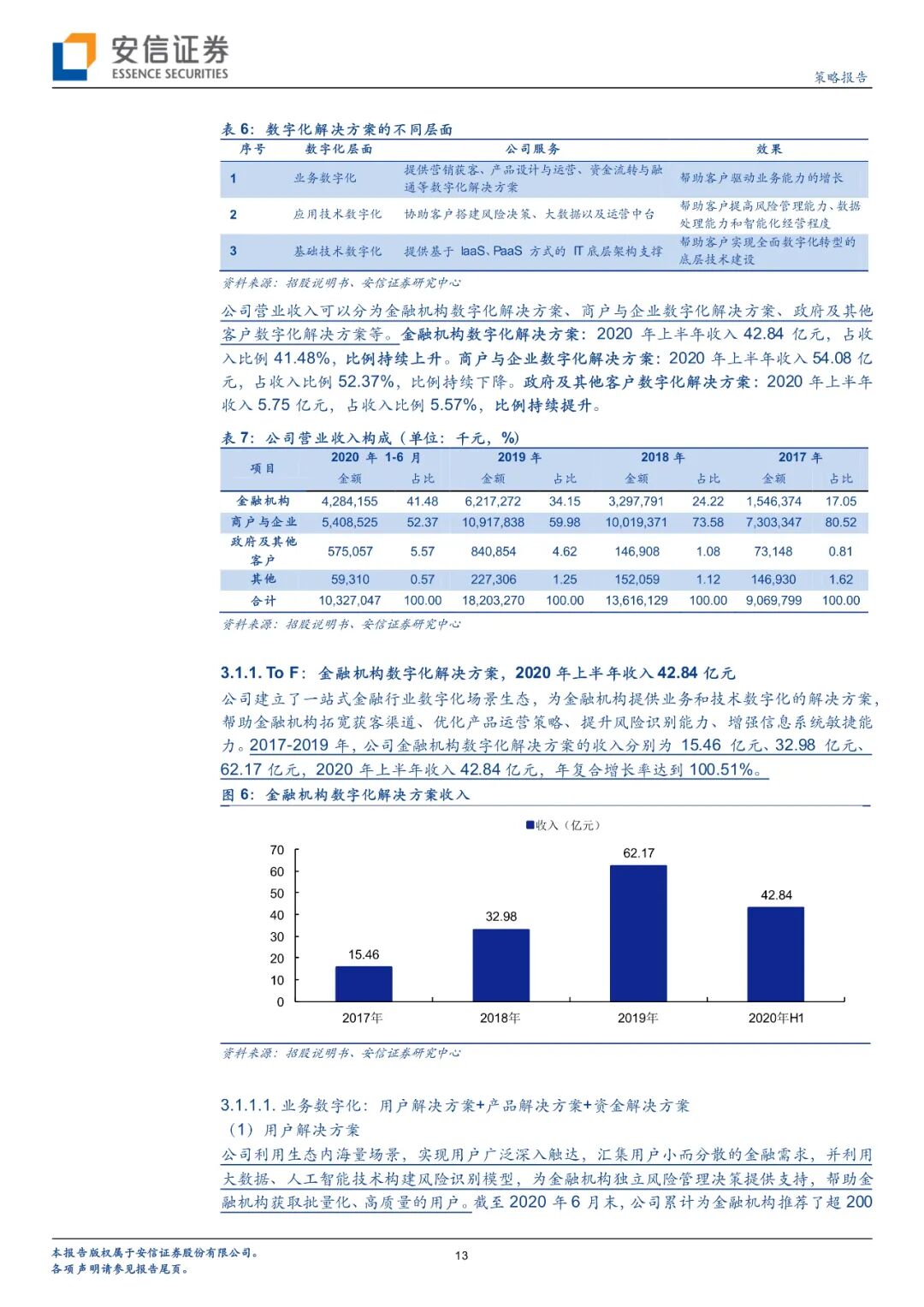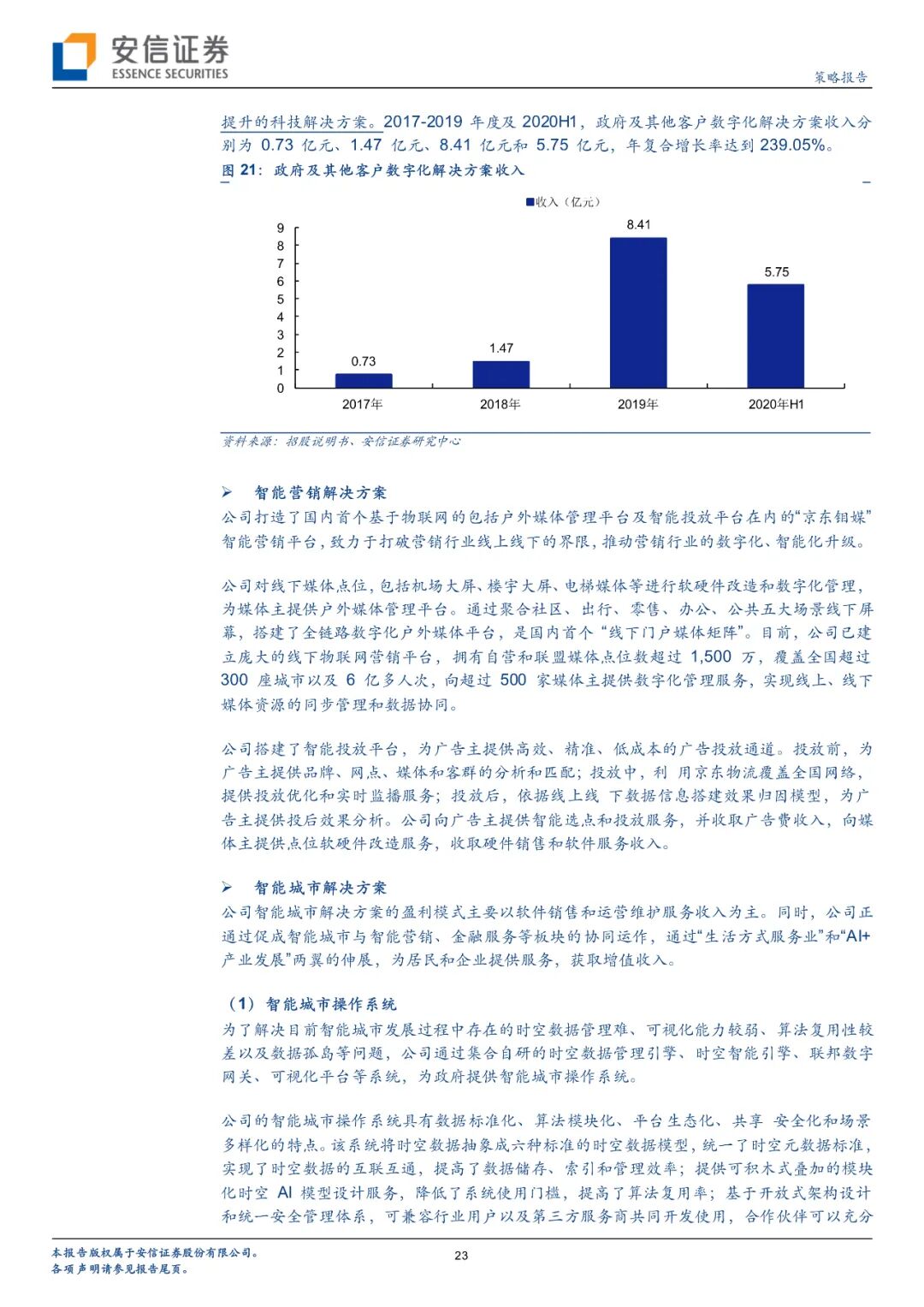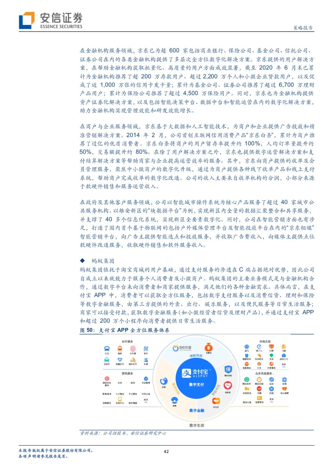 截至2020年6月末,在金融机构服务领域,公司已为超 600 家包括商业银行、保险公司、基金公司、信托公司、证券公司在内的各类金融机构提供了多层次全方位数字化解决方案;在商户与企业服务领域,已为超100万家小微商户、超20万家中小企业、超700家大型商业中心等提供了包括业务和技术在内的数字化解决方案;在政府及其他客户服务领域,公司以智能城市操作系统为核心产品服务了超过 40 家城市公共服务机构,已建立庞大的线下物联网营销平台,拥有自营和联盟媒体点位数超过1500万,覆盖全国超过 300 座城市以及 6 亿多人次。