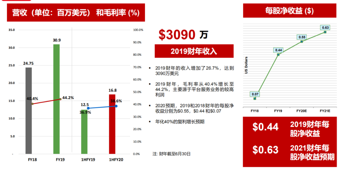 2019财年(截止2019年6月30日),公司收入3090万美元,同比增长26.7%,毛利率由40.4%提升至44.2%,每股收益0.44美元;