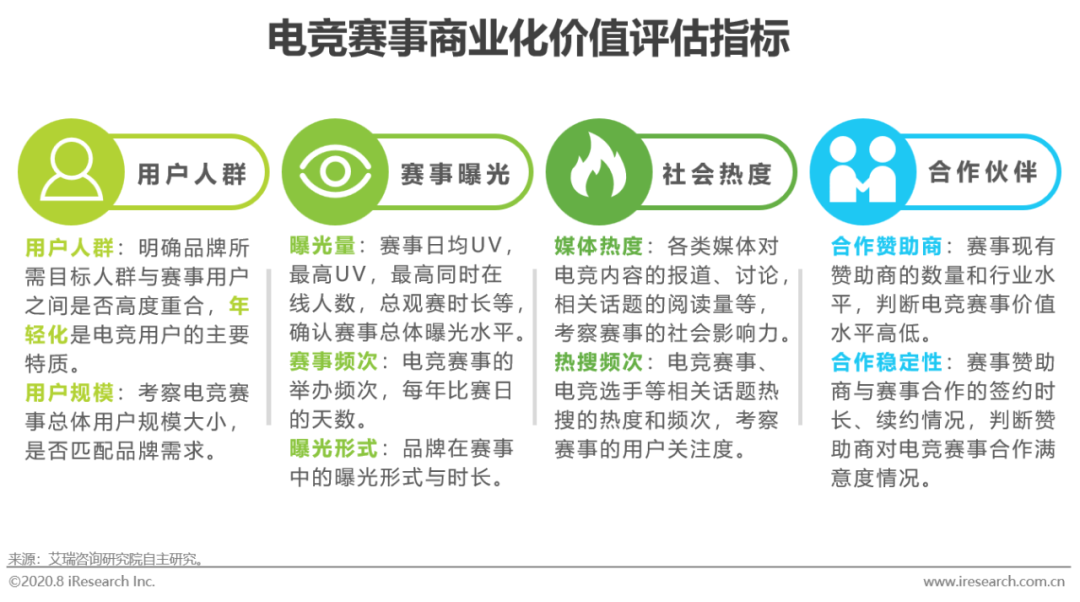 电竞是年轻人的聚集地,当企业有品牌年轻化、获取年轻用户等需求时,如何选择合适的电竞赛事是首先要面临的问题。综合考察一个电竞赛事商业化价值高低,可以从电竞赛事的用户人群、赛事曝光、社会热度及合作伙伴这四个方面出发,判断赛事整体商业化价值水平。