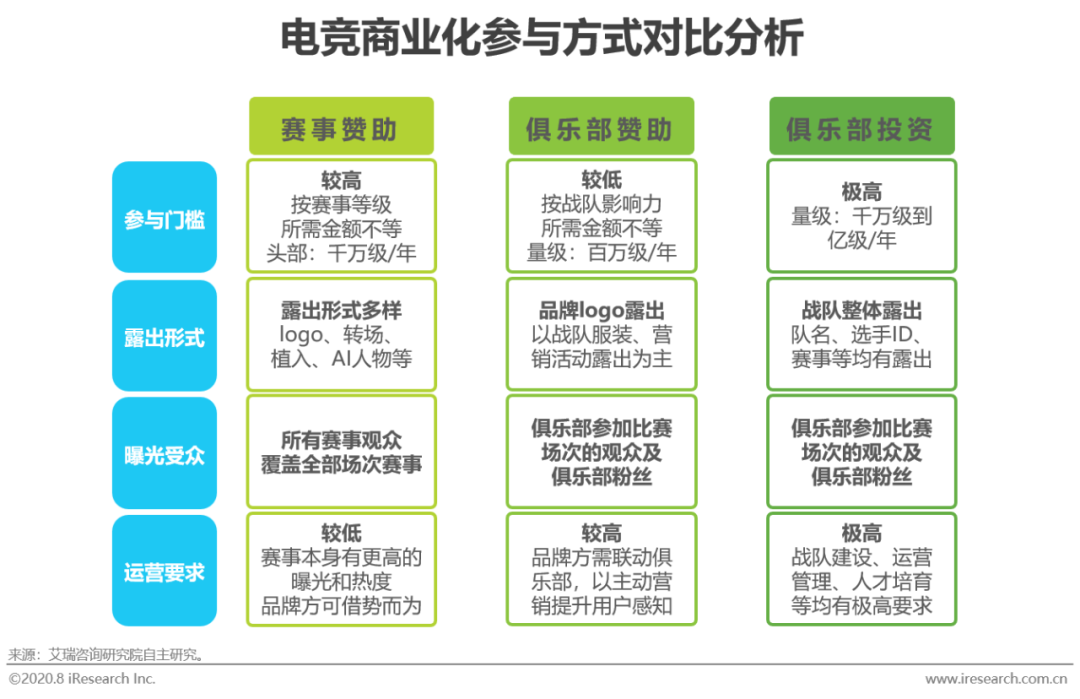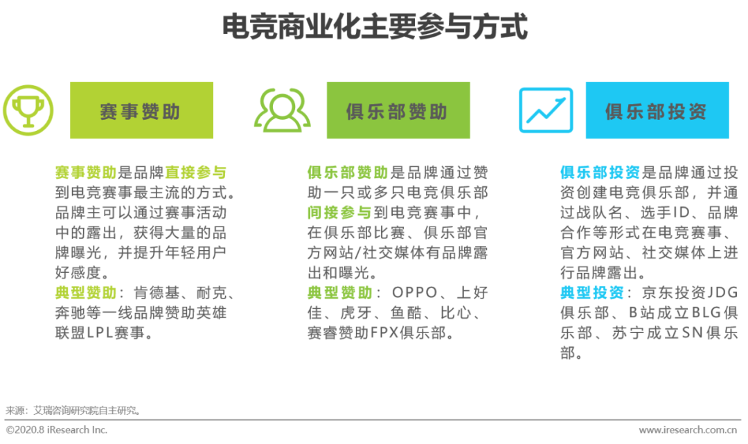 模式:赛事赞助、俱乐部赞助、俱乐部投资为品牌参与电竞赛事主要模式。品牌主可根据自身需求与能力选择如何进入电竞领域,达到电竞营销效果。