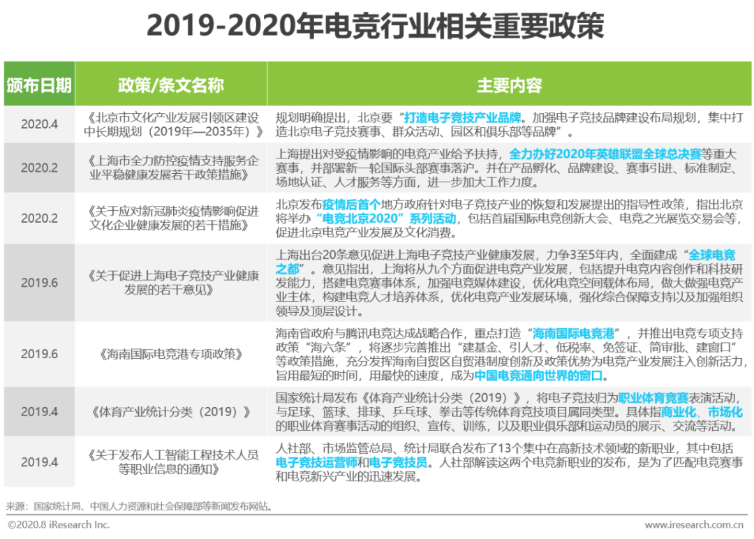 政策:电竞被国家归入职业体育竞赛表演活动,电子竞技员和电子竞技运营师成为官方发布新职业。多地发布电竞产业扶持政策,推动电竞与城市文化共同发展。