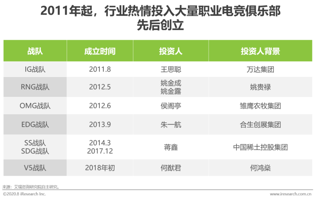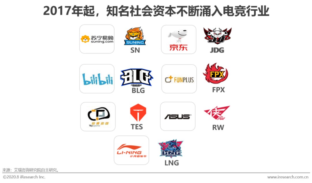 2011年起,随着第一方电竞赛事起步,与电竞一同成长的中国富二代们成为电竞行业领路人,依靠对电竞的热情投入创立众多知名职业电竞俱乐部。2017年起,随着电竞赛事用户规模与曝光量不断扩大,社会资本越来越关注电竞赛事这片价值洼地,通过成立电竞俱乐部,实现电竞行业布局并占领产业链上游。电商、视频、游戏、运动、硬件等品牌基于年轻用户获取、品牌声量提升、主营业务联动等目的,纷纷进入电竞行业,加速了电竞商业化前进步伐。
