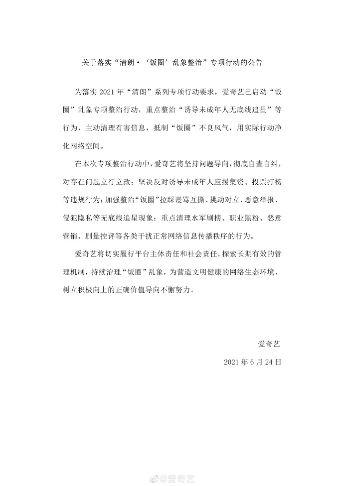 智通财经APP获悉,6月24日,爱奇艺(IQ.US)微博发布公告称,为落实2021年“清朗”系列专项行动要求,爱奇艺已启动“饭圈”乱象专项整治行动,重点整治“诱导未成年人无底线追星”等行为,主动清理有害信息,抵制“饭圈”不良风气,用实际行动净化网络空间。