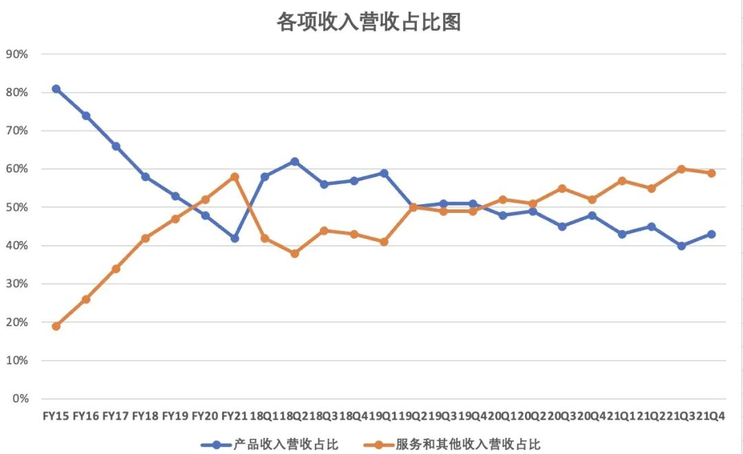 财报显示,2021财年Q4,微软产品收入198.86亿美元,较上年同期的181.47亿美元,增长10%,收入占比从上年同期的48%,下降至本季度的43%;
