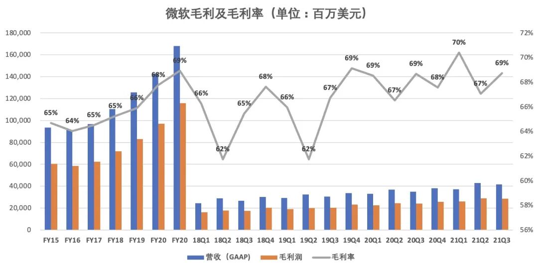 财报显示,2021财年Q4微软毛利为321.61亿美元,较上年同期的256.94亿美元,增长25%。2021财年Q4毛利率为70%,创历史新高。
