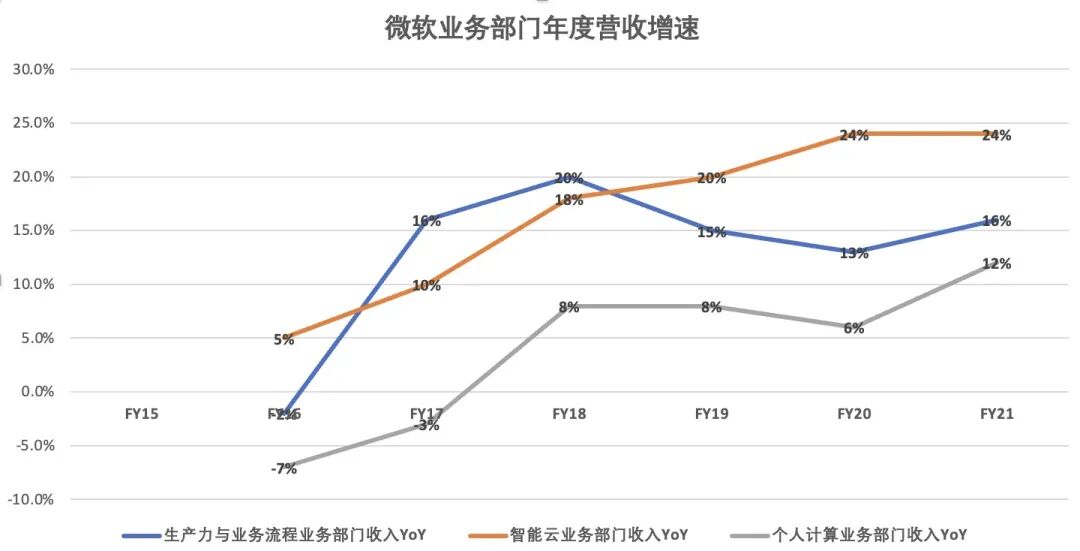 结合微软FY15-FY21的年报数据看,智能云业务也是微软增速最快的业务。如今智能云业务已成为微软营收增长的核心驱动力。