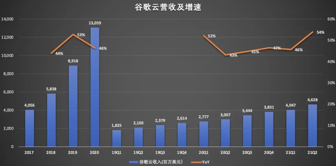 从谷歌最新披露的2021财年Q2财报数据看,谷歌云营收为46.28亿美元,较上年同期的30.07亿美元增长54%,这一增速高于微软智能云30%的同比增速。