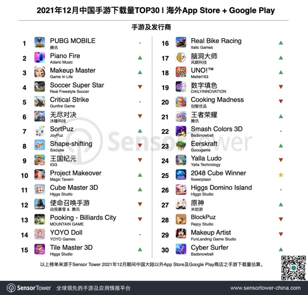 Tower商店情报平台最新数据显示,2021年12月中国手游产品在海外市场收入及下载量排行榜,其中,米哈游《原神》移动端海外收入超过9600万美元,蝉联出海手游收入榜榜首,腾讯控股(00700)《使命召唤手游》总收入突破13亿美元,网易-S(09999)《指环王》IP新游收入增长49%,详细榜单变化如下。