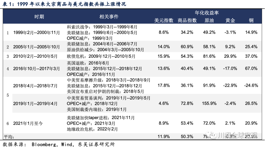 1999年2月—2000年11月:亚洲金融危机后,新兴市场国家复苏较为疲软,美国GDP增速领先于全球水平。在科索沃战争、美联储加息等因素的共同作用下,美元指数、铜价大幅上涨。同时,为抑制油价下跌压力,OPEC减产保价协议的达成以及发达经济体对原油需求量的增加,使得原油价格快速上涨。此次美元指数与大宗商品的共振上涨长达21个月。
