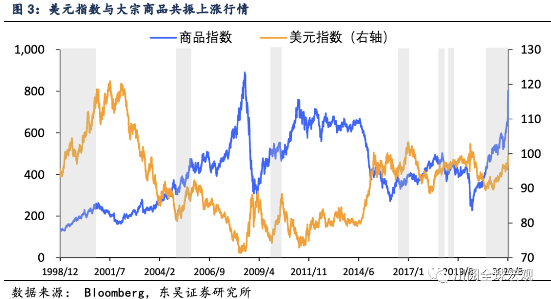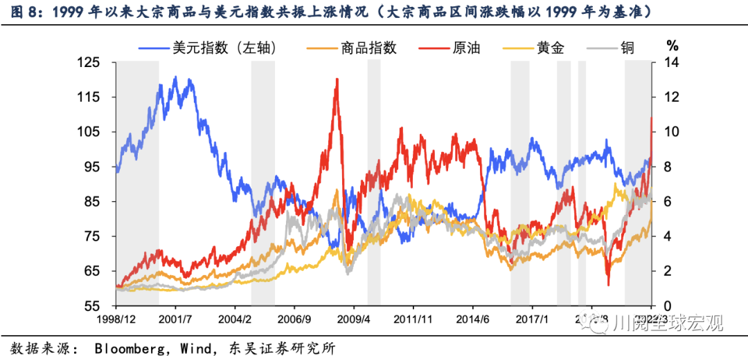 美元指数和大宗商品并无绝对的负相关关系。在市场不受商品供需等扰动因素影响时,商品的金融属性得到放大,美元走强会对以美元计价的大宗商品带来负面影响,使其隐性价格上升。然而美元指数与大宗商品的关联并不存在二元性,这一联系并不十分牢靠。自1999年以来,美元指数与大宗商品走势呈负相关的时间占比约为70%,两者同涨的时间约占20%左右。