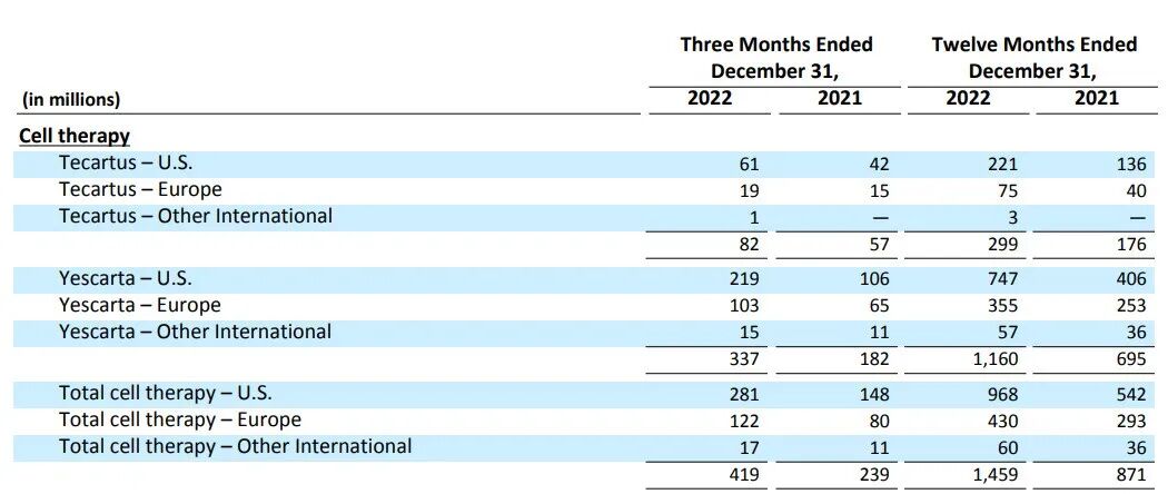 吉利德的两款靶向CD19的CAR-T疗法,Yescarta和Tecartus的销售额在2022年都实现了明显的增长。财报显示,Yescarta全年营收达到11.6亿美元,Tecartus全年营收2.99亿美元。